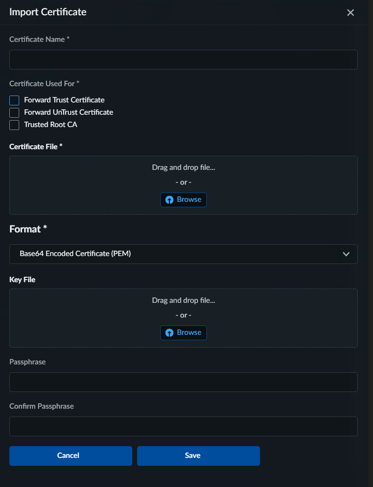 Drag and drop the Certificate File or Browse to select it (for example, .pem, .crt, .cer).From the Format drop-down, select the encoding type (for example, Base64 Encoded Certificate (PEM)).If the certificate includes a private key or is password-protected (for example, a PKCS12 file), drag and drop the Key File or use Browse to select it.If a passphrase is required, enter it in Passphrase and confirm it in Confirm Passphrase.Click Save.Modify or Delete a Custom Certificate