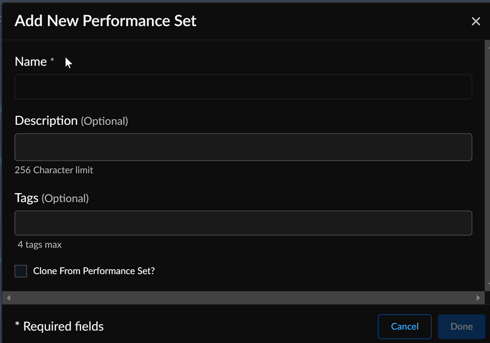 - Select ConfigurationPrisma SD-WANPoliciesPerformancePerformance Sets.Select Advanced and Add Set.On the Add New Performance Set screen, enter a Name for the performance set, and optionally enter description and tags.