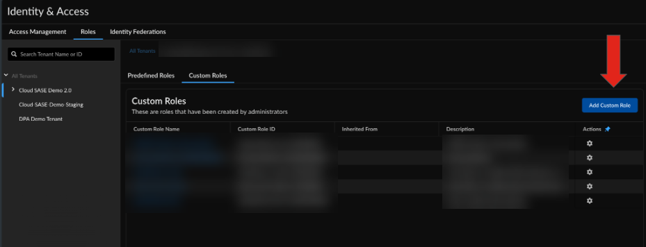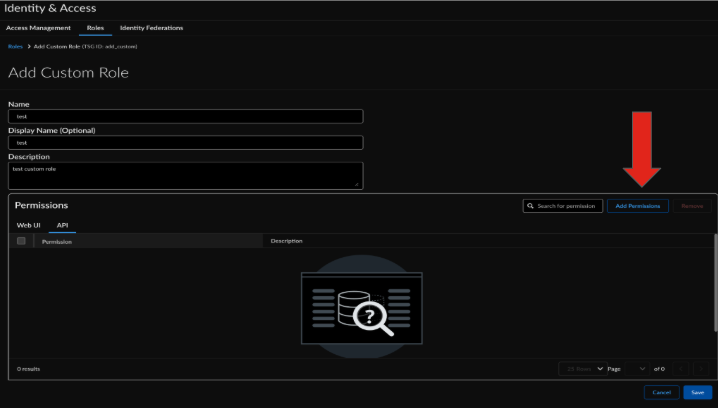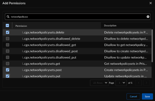 - Select System SettingsIdentity & Access ManagementRolesCustom RolesAdd Custom Roles.Add a Name and a Description for the role.![]() Add permissions. The permissions are split between web interface and API.If you select API: Any permissions that you had set using Web Interface are visible. You can't remove them from here, but you can remove them by changing them in Web Interface. Add permissions. The permissions are split between web interface and API.If you select API: Any permissions that you had set using Web Interface are visible. You can't remove them from here, but you can remove them by changing them in Web Interface.- Select Add Permissions to open the permissions modal. Permissions are listed in a hierarchy.![]() Expand Prisma SD-WAN and search for relevant API’s. Type in an API resource to search. Type in an API resource to search. For eg. to modify Path policies, search for “networkpolicysets” You can find the API resources from Unified SASE SD-WAN APIs.To allow or disallow specific actions for each resource, you'll need to expand each one and explicitly select "get," "post," "put," "delete," and "query" options. Simply choosing a resource from the initial screen won't be enough, as each resource offers both "allow" and "disallow" sub-options for fine-grained control.To manage permissions, explicitly select the "put," "post," and "delete" allow options for specific API actions, such as creating or deleting Path Policy sets (networkpolicysets). You do not need to select "get" because a base role like "view_only" will automatically allow get actions. Expand Prisma SD-WAN and search for relevant API’s. Type in an API resource to search. Type in an API resource to search. For eg. to modify Path policies, search for “networkpolicysets” You can find the API resources from Unified SASE SD-WAN APIs.To allow or disallow specific actions for each resource, you'll need to expand each one and explicitly select "get," "post," "put," "delete," and "query" options. Simply choosing a resource from the initial screen won't be enough, as each resource offers both "allow" and "disallow" sub-options for fine-grained control.To manage permissions, explicitly select the "put," "post," and "delete" allow options for specific API actions, such as creating or deleting Path Policy sets (networkpolicysets). You do not need to select "get" because a base role like "view_only" will automatically allow get actions.![]() Click Save the new custom role is created. Click Save the new custom role is created.Related CLIs- config banner