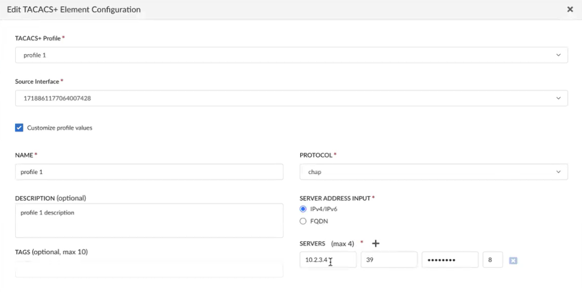 Select the TACACS+ Profile and then select the Source Interface.Enter profile Name, Description, and Tags.If you want to customize the profile values, select Customize profile values.Customize the server and protocol values; when editing the values for the first time, you need to reenter the values and Submit.You can view the profile custom values on the TACACS+ page of the AAA tab. You can edit or delete the customized server details.