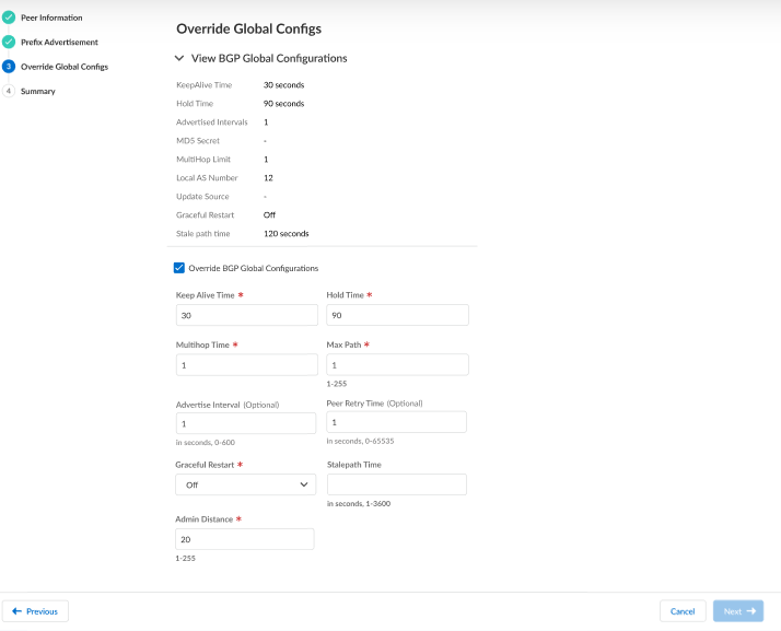 .On the Override Global Configs tab, you can View BGP Global Configurations. Click Next if you do not want to override the global configs; otherwise, proceed to the next step.- Select Override BGP Global Configurations to inherit the device's global configuration or select No to configure global configuration overrides.