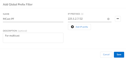 - Select ConfigurationPrisma SD-WANResourcesPrefix FiltersGlobal.Enter a Name, an optional Description, and an IP Prefix.