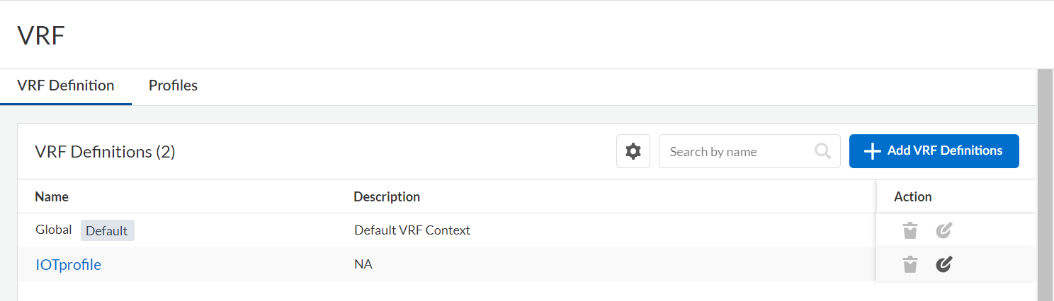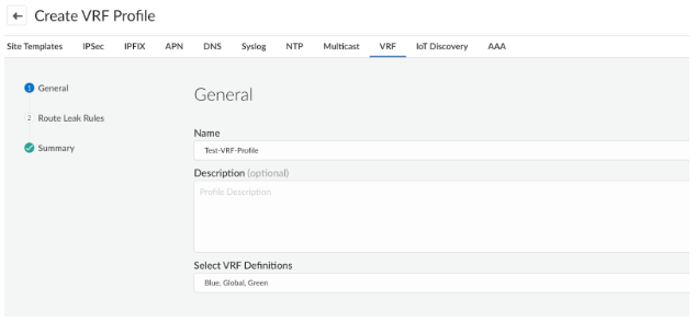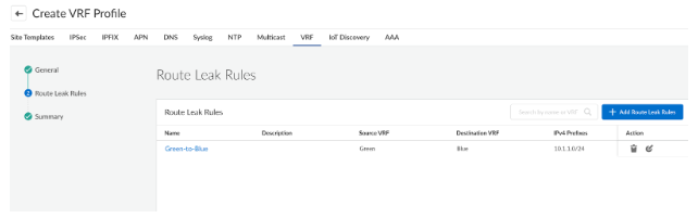 - Select ConfigurationPrisma SD-WANProfiles and TemplatesVRF to create VRF Definition and Profiles.![]() You can also create the VRF Profile from ConfigurationPrisma SD-WANData Centers. Select a Data Centers site. On the Configuration tab, click Create Profile and follow the steps below. You can also create the VRF Profile from ConfigurationPrisma SD-WANData Centers. Select a Data Centers site. On the Configuration tab, click Create Profile and follow the steps below.![]() You can also create the VRF Profile from ConfigurationPrisma SD-WANBranch Sites. Select a Branch Sites site. On the Configuration tab, click Create Profile and follow the steps below.Click Add VRF Definitions to add a VRF Definition to attach it to the VRF Profiles.The system generates a Global VRF Context by default, and it does not allow updating or deleting the Global VRF Context.When the associated VRF definitions of the new VRF profile include the VRF's currently attached to a Site, you can switch the site to the newly created one. Otherwise, you are not allowed to make changes. You can also create the VRF Profile from ConfigurationPrisma SD-WANBranch Sites. Select a Branch Sites site. On the Configuration tab, click Create Profile and follow the steps below.Click Add VRF Definitions to add a VRF Definition to attach it to the VRF Profiles.The system generates a Global VRF Context by default, and it does not allow updating or deleting the Global VRF Context.When the associated VRF definitions of the new VRF profile include the VRF's currently attached to a Site, you can switch the site to the newly created one. Otherwise, you are not allowed to make changes.- Enter a Name and optional a Description for VRF Definition.You can update or delete the created VRF Definition under the Action column (if you have not attached it to any of the VRF Profiles).On the Profiles tab, select Create Profile to add a new VRF Profile. On the Create VRF Profile screen:![]()  - Enter a Name, optional a Description, and Select VRF Definitions for the VRF Profile. Click Next to continue adding the Route Leak Rules or click Submit to stop the further configurations.On the Route Leak Rules, you can see the Route table with the existing rules if available. Click Add Route Leak Rules to create a new rule. Enter a Name, optional a Description, Source VRF, Destination VRF, and IPv4 Prefix. Click Next.The leaked IPv4 prefix in the route leak rule must match the prefix configured on the interface.![]() View Summary to see the detailed information before submitting the new VRF Profile. View Summary to see the detailed information before submitting the new VRF Profile.Related CLIs