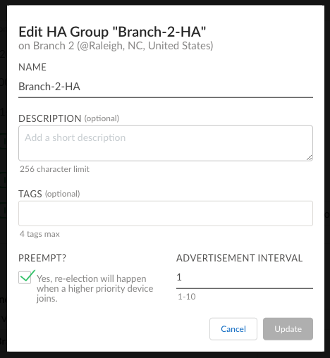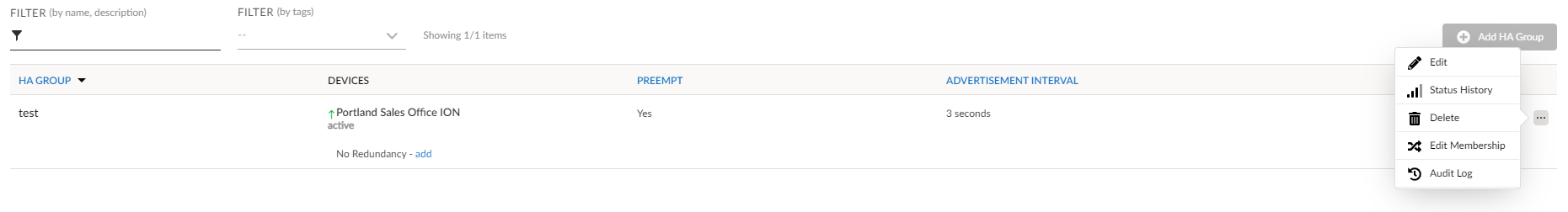 - Select ConfigurationBranch Sites.Select the site and from the ellipsis menu, select HA Groups.On the HA Groups screen, from the ellipsis menu of the selected HA group, select Edit.