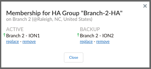To edit HA Group Membership, on the HA Groups screen, from the ellipsis menu of the selected HA group, select Edit Membership.On the Membership for HA Group screen, you can choose among replace, remove or add options to replace, remove or add ION devices respectively.
