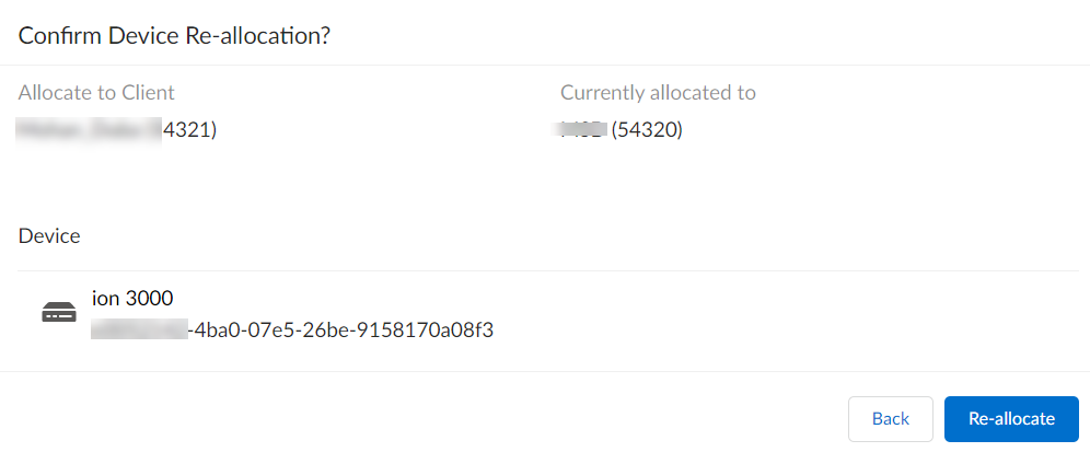 Re-allocate the device to a client tenant.- Select the device state To Return from the Any State drop-down.The device must be marked To Return by the client tenant for the MSP to re-allocate the device.Select the device from the list and click Re-allocate from the ellipsis menu.From the Re-allocate Device window, select Any Client available to the MSP.Confirm to Re-allocate the device.