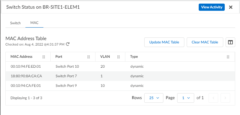 Select Update MAC table to update the table.View the Switch Activity by clicking the View Activity icon.The following activity reports are available on the Activity dashboard.- CPU Utilization