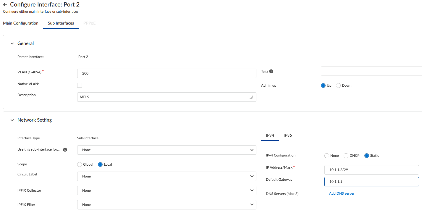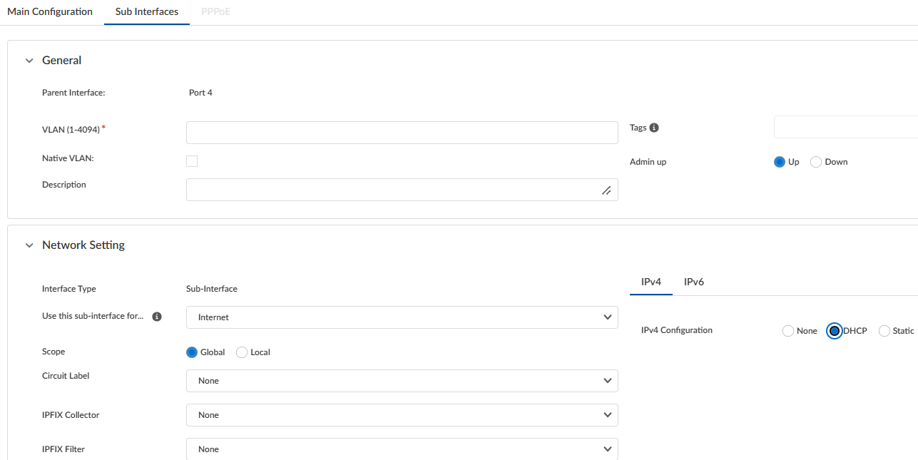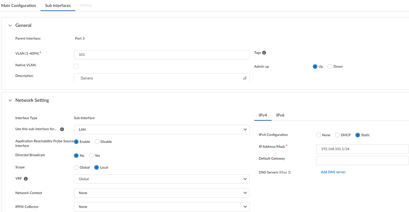 - Leave Use This Port To and IPv4 Configuration as None.For VRF, select Global or any other custom VRF listed. VRF Global is enabled only when the associated device supports VRF.Currently, VRF supports LAN. Configure the sub-interface individually, as the sub-interface configurations don’t inherit from the parent interface.Save Port.Click the Sub-Interfaces tab, Select + Add Sub-Interface to create a new sub-interface.In the General section,