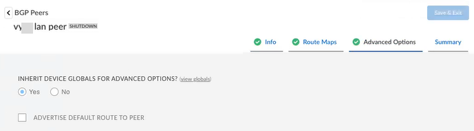 Prefix AdvertisementThe branch gateway site performs prefix advertisement and distribution in a variety of topologies.Prefix Advertisement Learned Via Advertised To Fabric Tunnel LAN BGP PeerStandard VPN Tunnel BGP Peer LAN BGP PeerLAN BGP Peer Fabric → yesLAN BGP Peer → yesPrivate WAN BGP Peer → yesPrivate WAN BGP Peer LAN BGP Peer → yes LAN Static Route Fabric → yesLAN BGP Peer → yesPrivate WAN BGP Peer → yesDefault Route in WAN BGP Peer.Prisma SD-WAN has enhanced the existing BGP Global configuration to allow an option to choose the default route as part of the prefix advertisement to WAN.For a BGP peer, select Advertise Default Route to Peer to distribute the default route to the peer, instead of explicitly configuring a prefix via route-maps.![]()