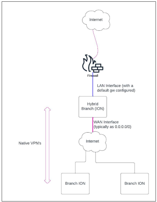 - Select ConfigurationBranch Sites and click the ellipsis menu for the site.Select Switch to Branch Gateway Site.Switching a branch site to a branch gateway site causes the ION device to reboot. When you convert a branch site to branch gateway, make sure to have all the branches connected to this branch gateway site (physical and virtual ION devices) running software versions 6.4.1 or higher.![]() Alternatively, you can select Branch Sites, then select a site and then enable Branch Gateway.Edit branch gateway site settings.(Optional) After you create a branch gateway site, you can optionally edit the branch gateway site settings. Alternatively, you can select Branch Sites, then select a site and then enable Branch Gateway.Edit branch gateway site settings.(Optional) After you create a branch gateway site, you can optionally edit the branch gateway site settings.![]() Select Prefer LAN Default over WAN in case your topology needs to take the LAN interface (with a default gateway) as the default route. This will mimic the path selection behavior of a data center site where the device forwards all incoming WAN traffic to the LAN peer. Select Prefer LAN Default over WAN in case your topology needs to take the LAN interface (with a default gateway) as the default route. This will mimic the path selection behavior of a data center site where the device forwards all incoming WAN traffic to the LAN peer.![]() For example, if the traffic flow is — Branch ↔Branch Gateway ↔ LAN (Firewall → Internet). Typically, the ION device will have a default route (0.0.0.0/0) on the internet (WAN) interfaces (with the next hop as the default gateway configured on the wan interface or from DHCP). This is to steer packets to the internet (for DIA or otherwise) if no other specific route exists. In this particular scenario, the branch gateway site needs to take the LAN interface. The LAN interface has a default gateway configured either statically or via DHCP as a default route as against an internet interface, which would generally have a default route. You can achieve this by adding a default route with a lower admin cost on the LAN interface than the WAN interface when you select Prefer LAN Default over WAN.Maximum Branch Site Count Info indicates the maximum number of branch sites that you can associate with a branch gateway site. If you exceed this number, Prisma SD-WAN generates an incident. However, it will still be possible to associate branches to the branch gateway by joining the domain or through the establishment of manual tunnels.Create VPNs between branch gateway sites or branch sites. For example, if the traffic flow is — Branch ↔Branch Gateway ↔ LAN (Firewall → Internet). Typically, the ION device will have a default route (0.0.0.0/0) on the internet (WAN) interfaces (with the next hop as the default gateway configured on the wan interface or from DHCP). This is to steer packets to the internet (for DIA or otherwise) if no other specific route exists. In this particular scenario, the branch gateway site needs to take the LAN interface. The LAN interface has a default gateway configured either statically or via DHCP as a default route as against an internet interface, which would generally have a default route. You can achieve this by adding a default route with a lower admin cost on the LAN interface than the WAN interface when you select Prefer LAN Default over WAN.Maximum Branch Site Count Info indicates the maximum number of branch sites that you can associate with a branch gateway site. If you exceed this number, Prisma SD-WAN generates an incident. However, it will still be possible to associate branches to the branch gateway by joining the domain or through the establishment of manual tunnels.Create VPNs between branch gateway sites or branch sites.![]() Prisma SD-WAN establishes VPN tunnels as follows: Prisma SD-WAN establishes VPN tunnels as follows:- Branch -> Branch Gateway (Same Domain) — Prisma SD-WANautomatically builds Fabric VPN tunnels.