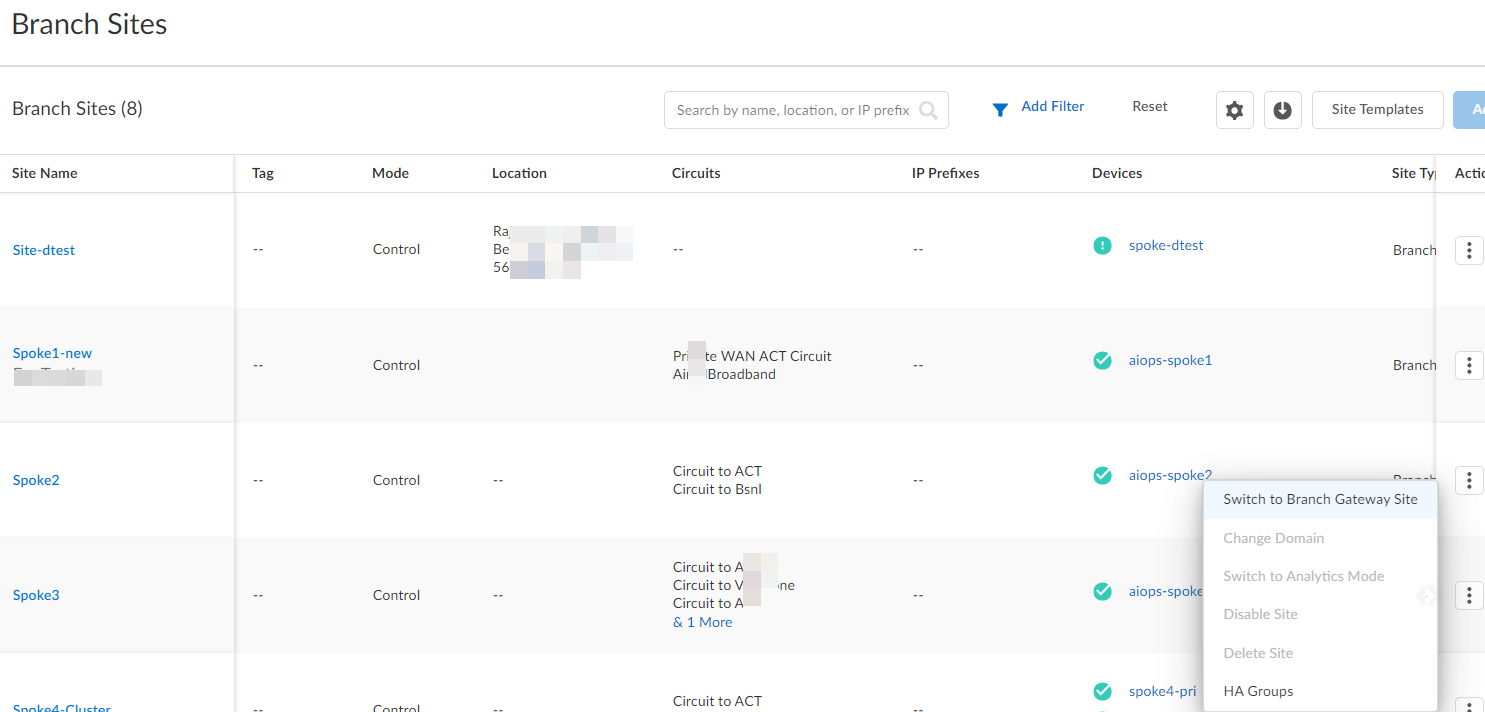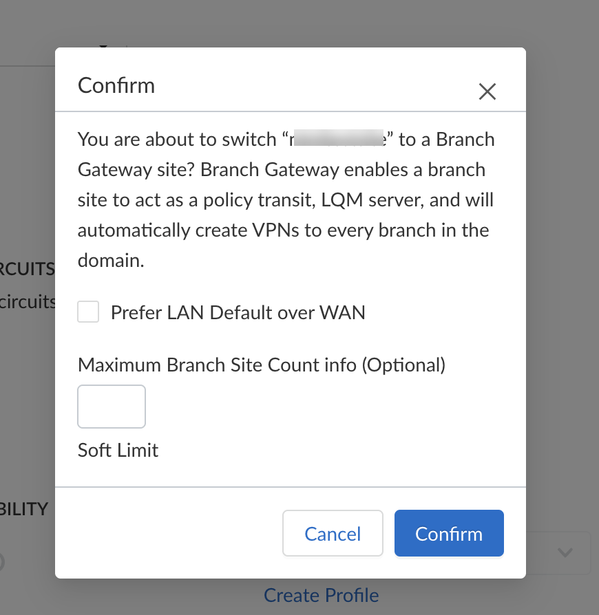 Avoid deploying Branch Gateways in a full-mesh VPN topology (more than two gateways connected to each other). This configuration carries a potential risk for traffic loops and network instability.- (Optional) Changing the domain of a branch gateway site.- Select a branch gateway site.