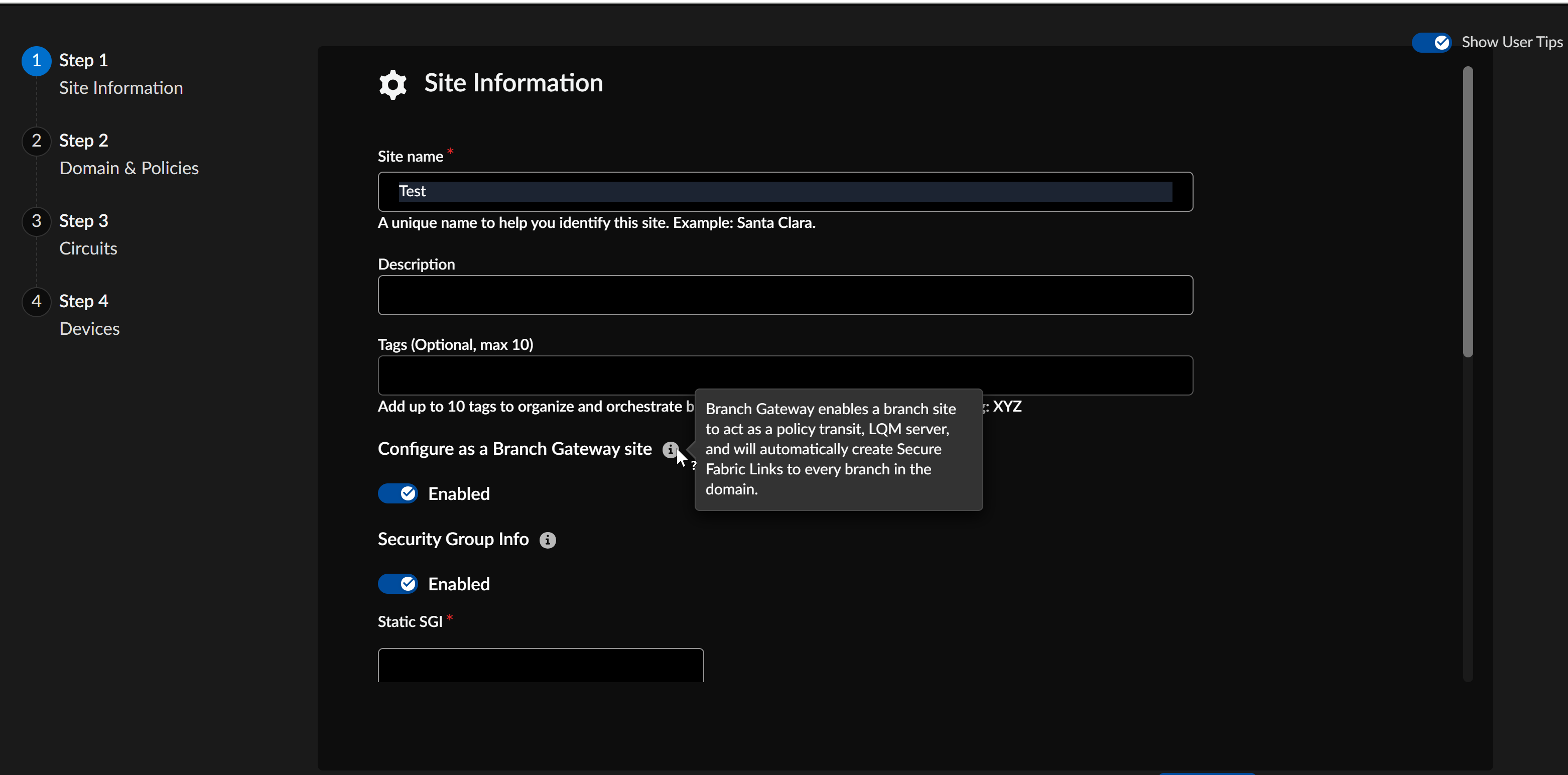 - Create a new branch gateway site.- Select ConfigurationPrisma SD-WANBranch SitesAdd Site.Add a Site Name and optionally enter description and tags.Enable Configure as a Branch Gateway Site.![]() Verify the Static SGI value to be between 1 and 65533 for the ION generated traffic. The Security Group Information option is enabled by default for Static tag configuration.Add the other details to set up a site and click Save & Exit.Assign a device to the created branch gateway site, enable L3 Direct Private WAN Forwarding and L3 LAN Forwarding for the device and then configure the interfaces.Convert an existing branch site to a branch gateway site.You can convert an existing branch site to a branch gateway site.Ensure that: Verify the Static SGI value to be between 1 and 65533 for the ION generated traffic. The Security Group Information option is enabled by default for Static tag configuration.Add the other details to set up a site and click Save & Exit.Assign a device to the created branch gateway site, enable L3 Direct Private WAN Forwarding and L3 LAN Forwarding for the device and then configure the interfaces.Convert an existing branch site to a branch gateway site.You can convert an existing branch site to a branch gateway site.Ensure that:- The site is in Control mode.