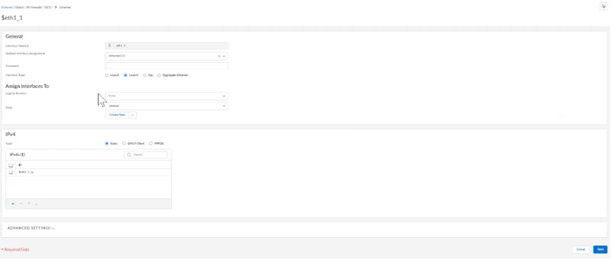 Configure the LAN and WAN interfaces on the NGFW. Set IP addresses for public