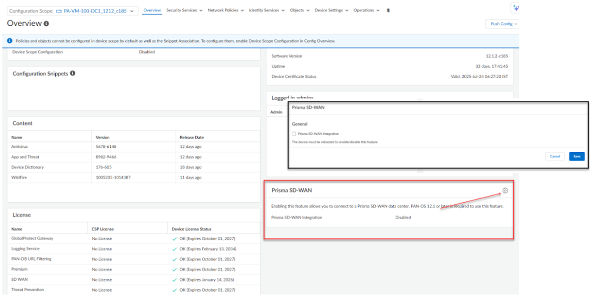 Enable Prisma SD-WAN on NGFW and push config; device restarts.