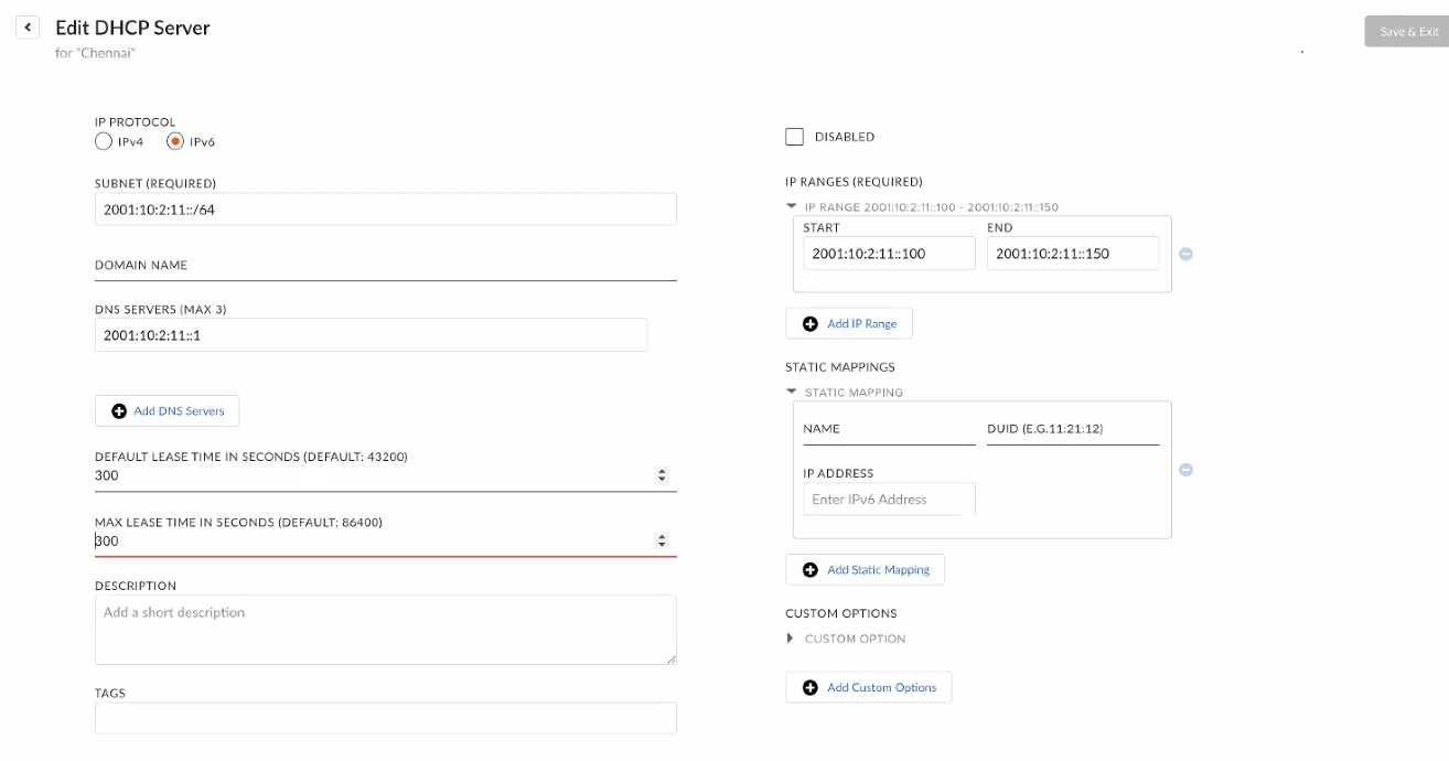 On the Create DHCP Server screen, configure the DHCP Server and its attributes. You can either choose IPv4 or IPv6 for the IP Protocol.IPv4- Select IPv4.For Subnet, enter the subnet for which the DHCP server is being configured.For Broadcast Address, the address is auto populated based on the prefix provided in the Subnet field.For Gateway, enter the default gateway for clients.For Domain Name, enter the domain name for clients.For DNS Servers, enter the domain name servers for clients to resolve DNS requests.For Default Lease Time, enter a lease time each client will get if a user does not request a particular lease time.A user sets the default lease time to the lease time they would like all clients to use.For Max lease time, enter a value.Max lease time is the maximum lease time each client can request. The default lease time can be the same as max lease time.For Description, enter a description for each instance of the DHCP server, per subnet.Check the Disabled box to disable and uncheck it to enable the configuration.Disabled provides the ability to temporarily disable the DHCP server instead of deleting it.For IP Ranges, define multiple start/stop ranges from which allocation will be done when a broadcast DHCP request from clients or unicast DHCP relay request from a Layer 3 switch are received.For Static Mappings, Add Static Mapping details.IP addresses can be assigned to clients by statically mapping IPs to MAC addresses of the clients.For Custom Options, Add Custom Options like Vendor Class ID, Definition, and Value.The following data types are supported: