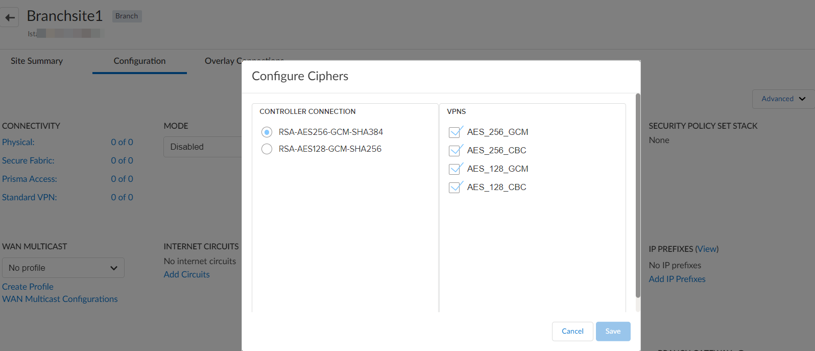 Select the required ciphers and Save.All the ciphers are selected by default only for newly created sites.You can view the selected ciphers between sites by selecting ConfigurationPrisma SD-WANBranch Sites. Select a site, click Overlay Connections and then select Edit Secure Fabric Link.Related CLIs