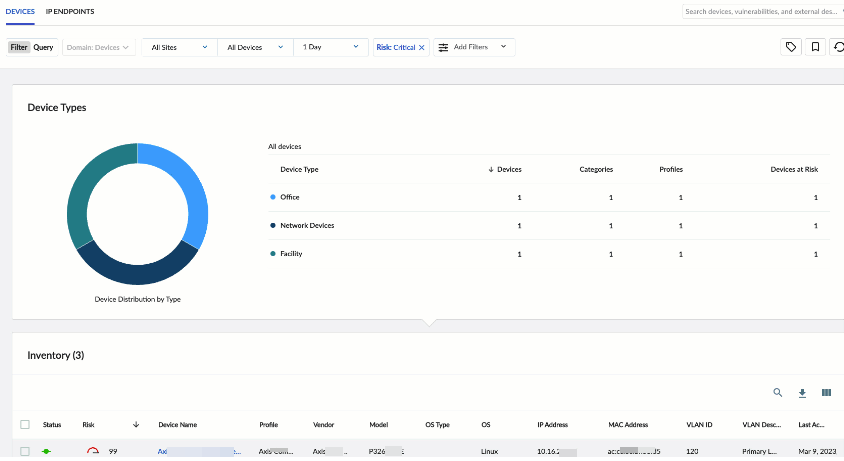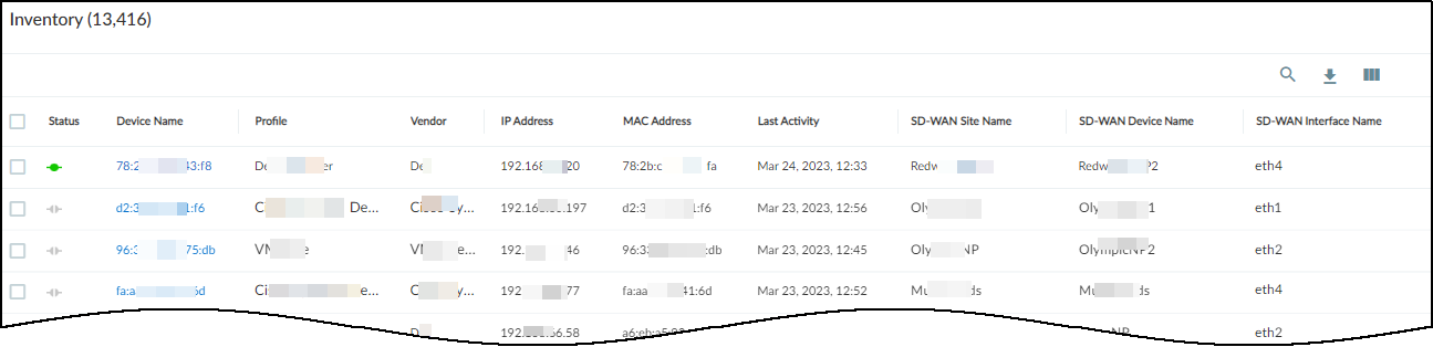 After Device Security receives data in Traffic logs from Prisma SD-WAN ION devices and starts discovering and identifying network-connected devices at branch sites, it displays its findings in the Inventory table on the Devices page in the Device Security portal. For each device thatDevice Security learned from Prisma SD-WAN, it displays various device attributes such as its IP and MAC address, device category, vendor, model, and OS as well as several identifying attributes of the ION devices that provided the logs such as:- Prisma SD-WAN site name
