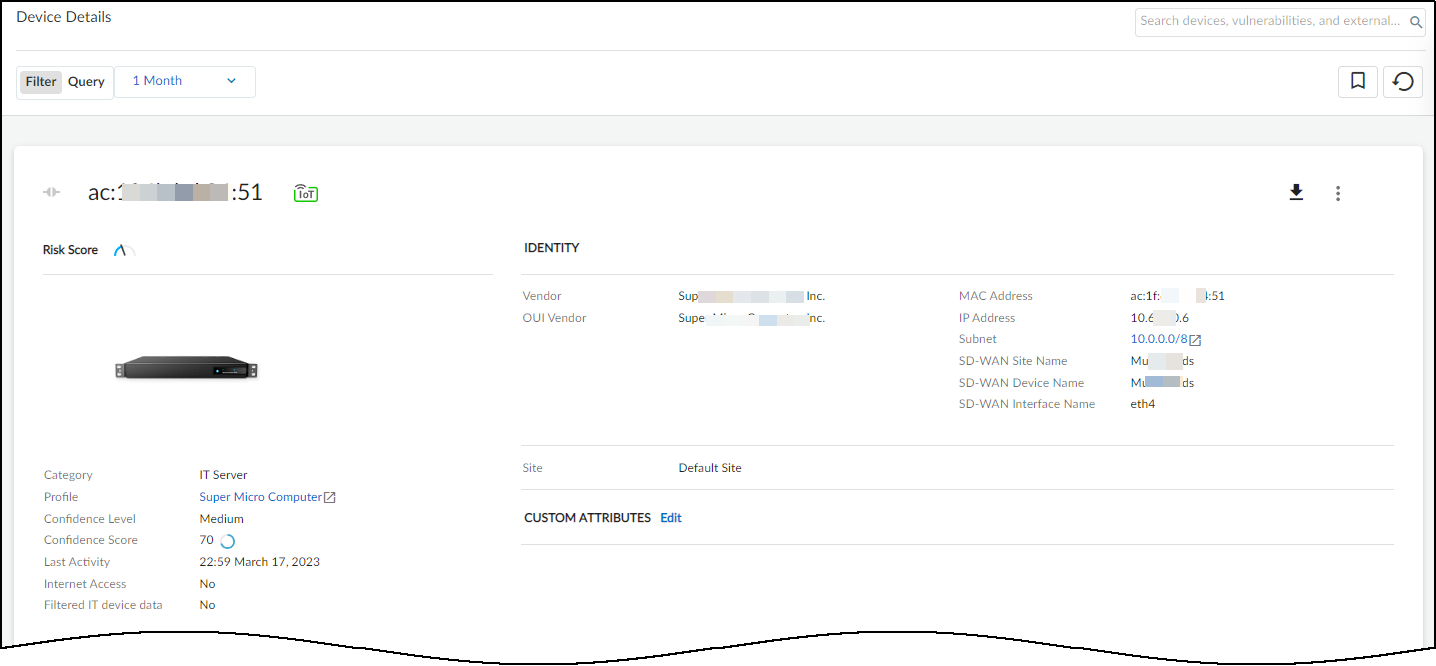 View device information learned from Prisma SD-WAN sites in the Device Security portal.- Navigate to the IoT Security portal and select the Devices tab to view device details.