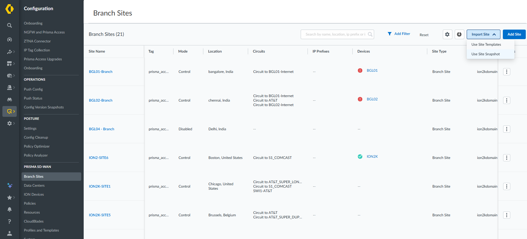 1. Navigate to the ConfigurationPrisma SD-WANBranch Sites or Data Centers.