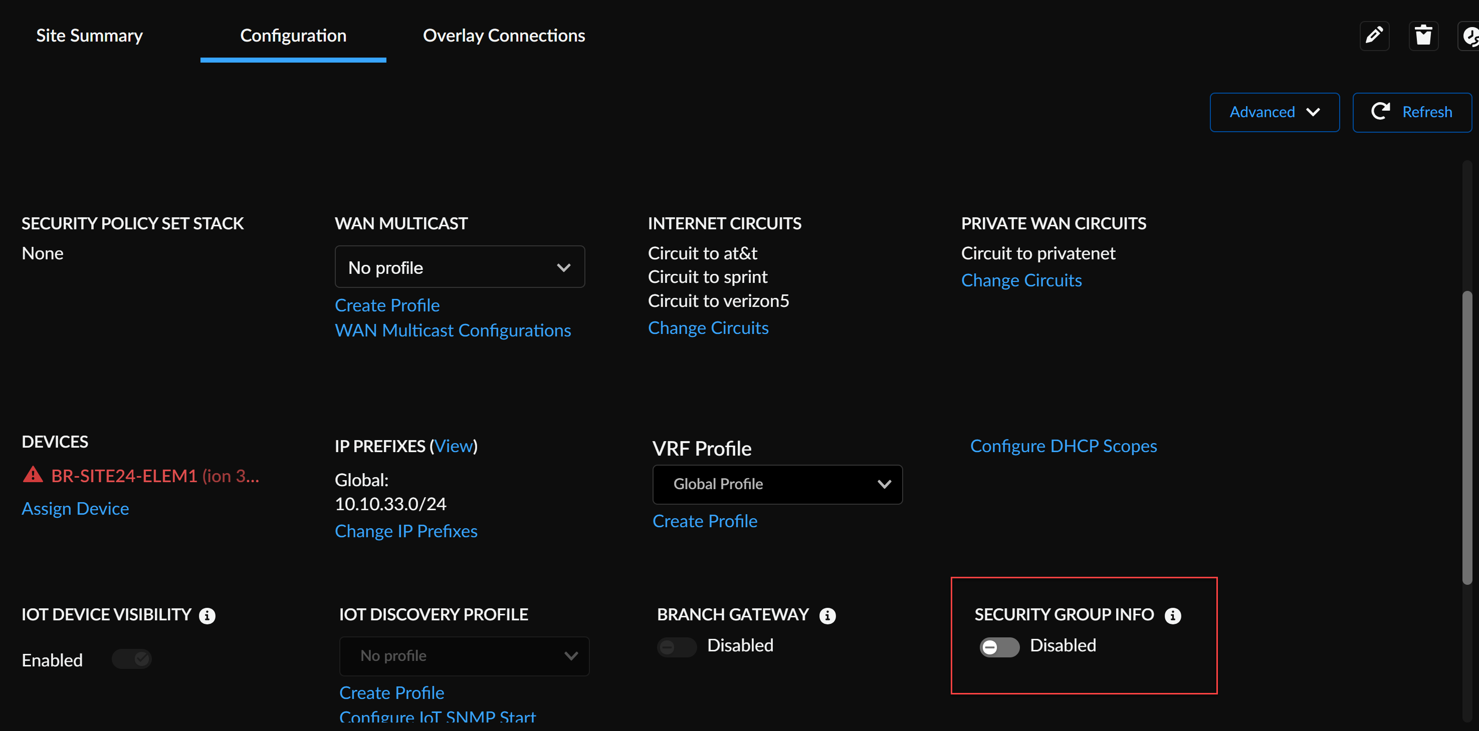 - In Strata Cloud Manager, go to ConfigurationPrisma SD-WAN Branch/Data CenterSites.Select the site name and go to the Configurationtab.Enable the Security Group Info (SGI) option.