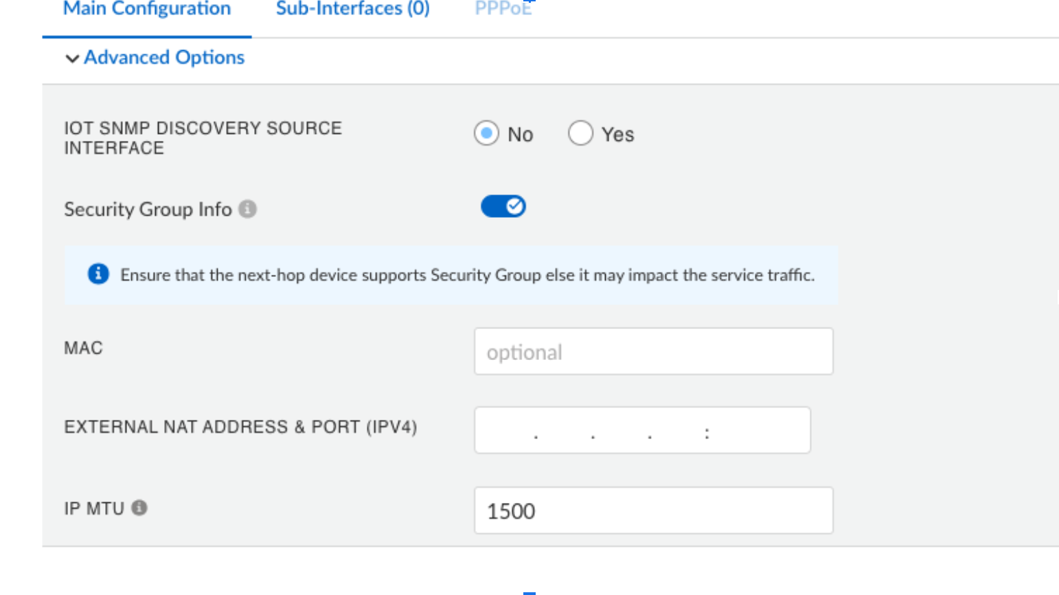 After enabling SGI at the site level, navigate to ConfigurationPrisma SD-WANION DevicesInterfacesAdvanced Options and enable Security Group Info.