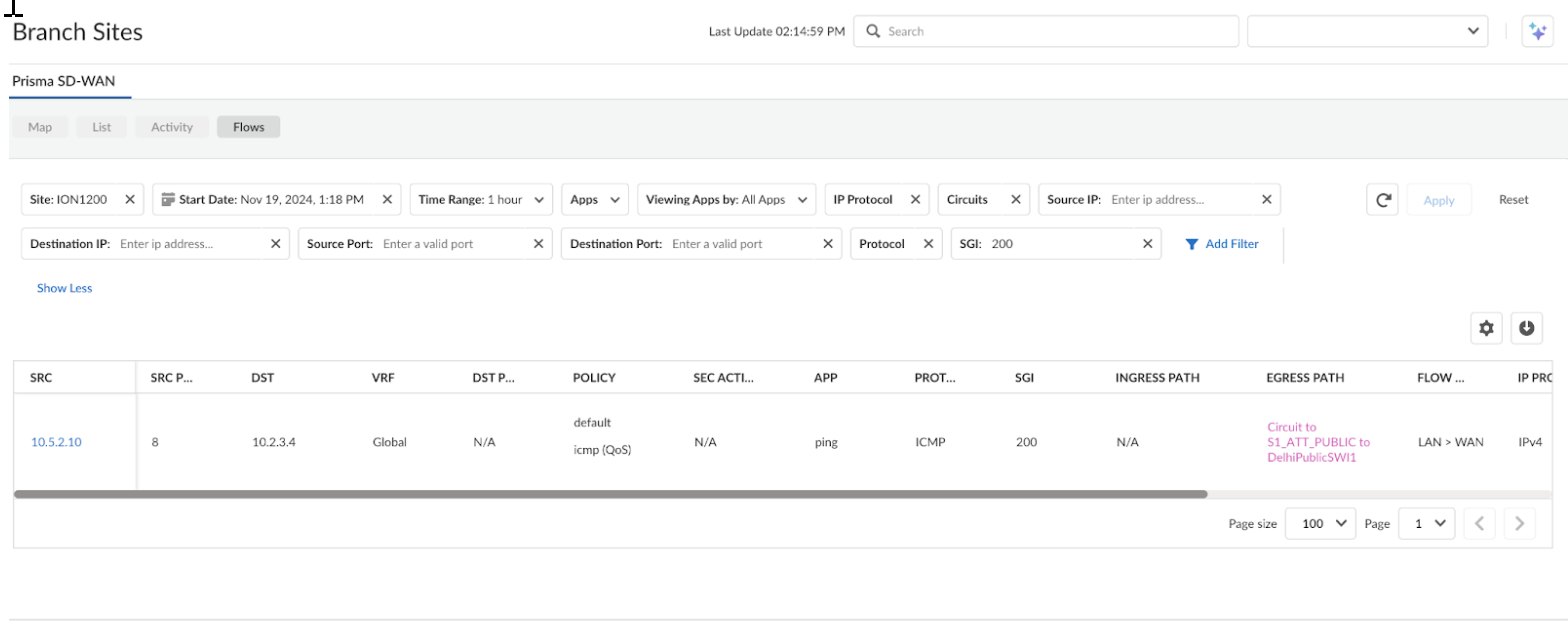 This setting appears only when you enable SGI at the site level as it applies the site-level value directly to the device. This configuration supports static tagging for ION-generated traffic only.To view the SGI information for a flow, go to ConfigurationPrisma SD-WAN Branch SitesFlows.If SGI is enabled, the system includes the value in the flow attributes.