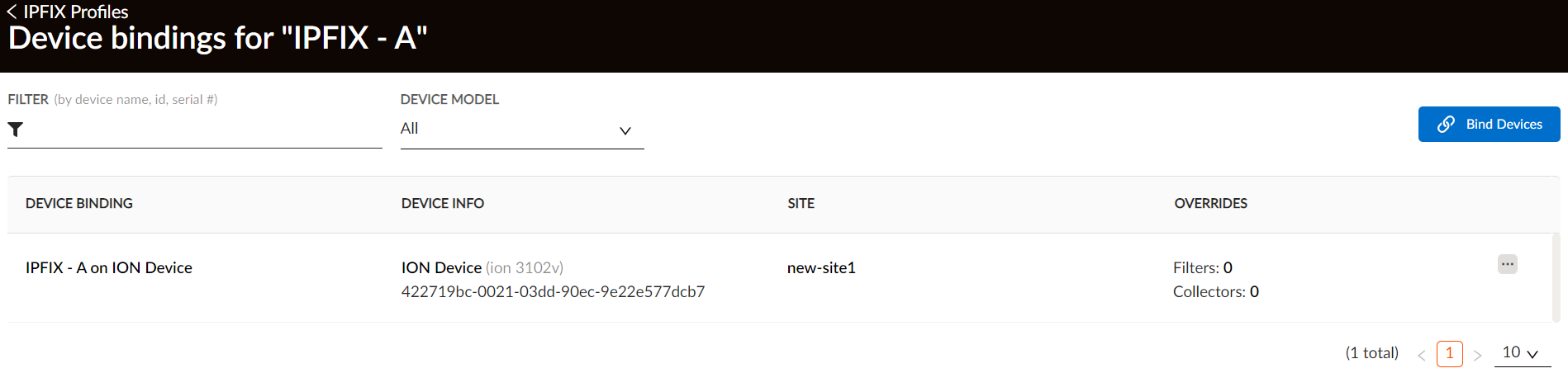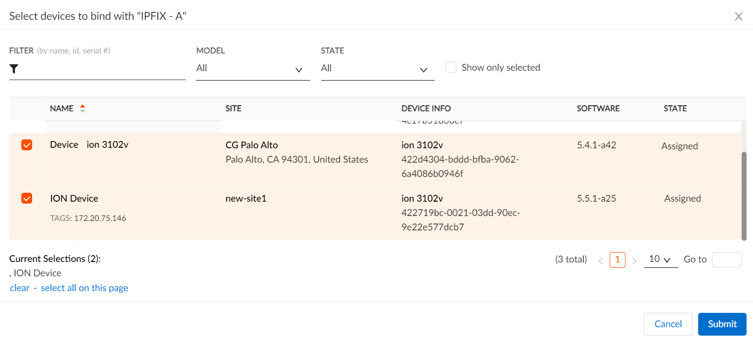 Attach an IPFIX profile to an ION device or multiple ION devices to push the IPFIX configuration to the device. You can attach IPFIX profiles only to branch ION devices.Multiple ION devices across different sites can use a single IPFIX profile.- Select ConfigurationPrisma SD-WANION DevicesClaimedSelect a deviceConfigure the deviceIPFIX.Click the ellipsis icon for a profile, select View Device Bindings, and then click Bind Devices.Select one or more ION devices from the list to associate with the selected IPFIX profile and Submit.