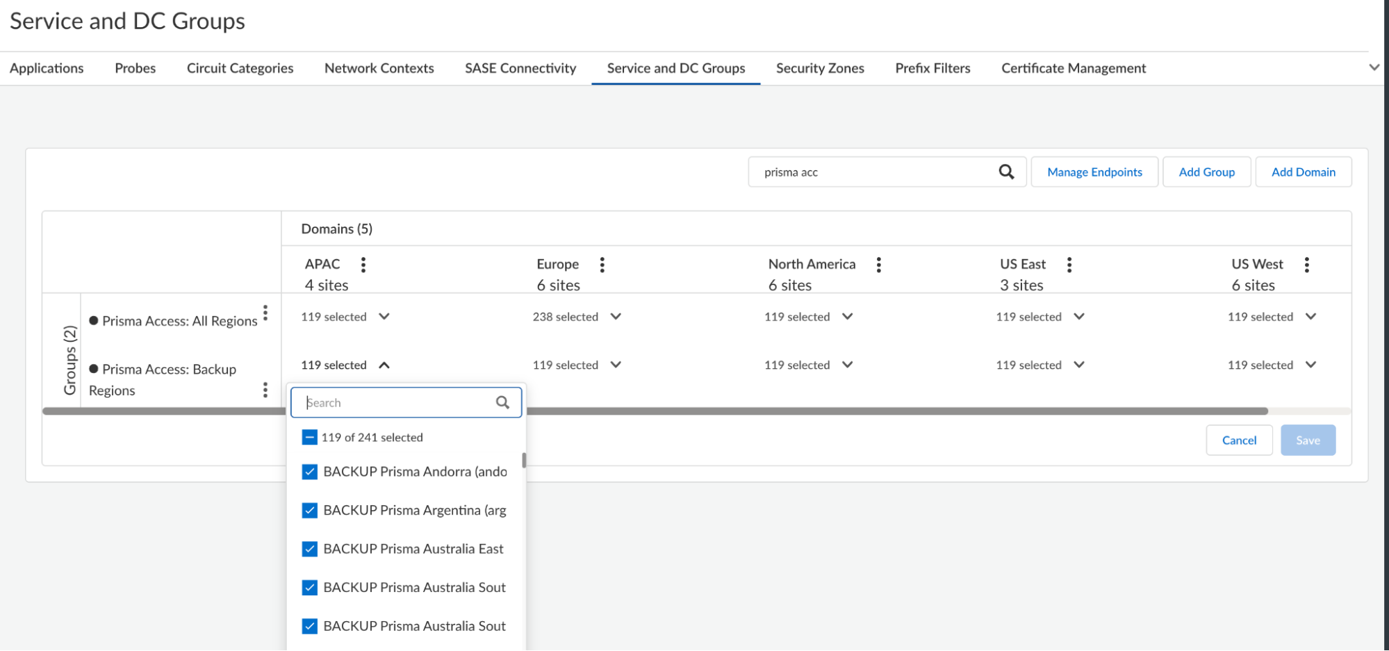 A domain is a collection of groups which can be assigned to a set of sites. There can be multiple domains defined, but a site can only be assigned to one domain at a time.- Select ConfigurationPrisma SD-WANResourcesService & DC GroupsAdd Domain.Add a Domain Name in the popup, and select Done.Map the service endpoints to the appropriate groups under each domain and select Done.If more than one endpoint are part of a group, they are considered as equal in network policy path selection.Proceed to bind domain to sites.