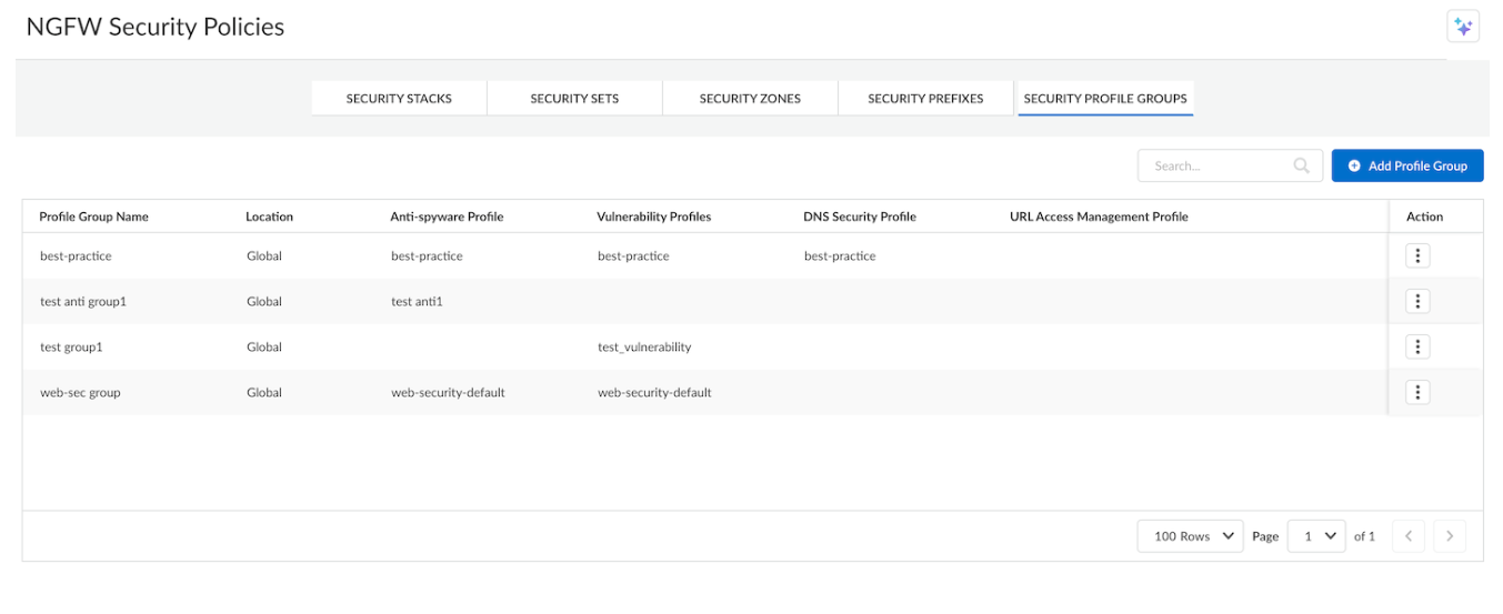 Save the configurations.The Profile Group will now be listed in the Policies page. Select the ellipsis to edit, clone, or delete an existing profile group.You cannot delete a Security Profile Group if one or more security policy rules are using it.Select a Security Policy Set to create a Security Policy Rule. After entering all the required rule information, you can select the Security Profile Group for that Security Policy Set.