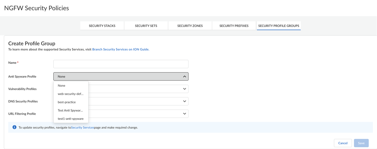 - Go to ConfigurationNGFW and Prisma Access.Select Configuration Scope and choose Global.All security service profiles used by Prisma SD-WAN will be managed and maintained within the Global Scope.Select the Security Services drop down menu to modify existing security service profiles or create new ones.