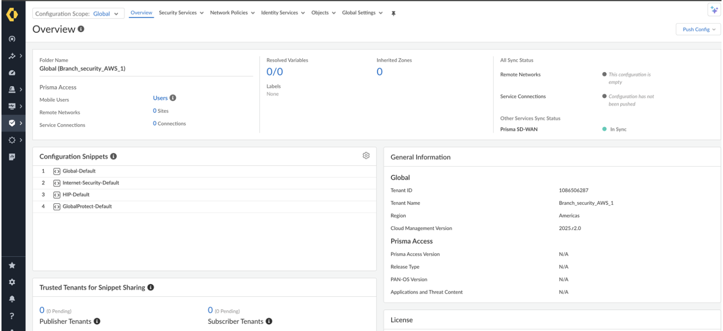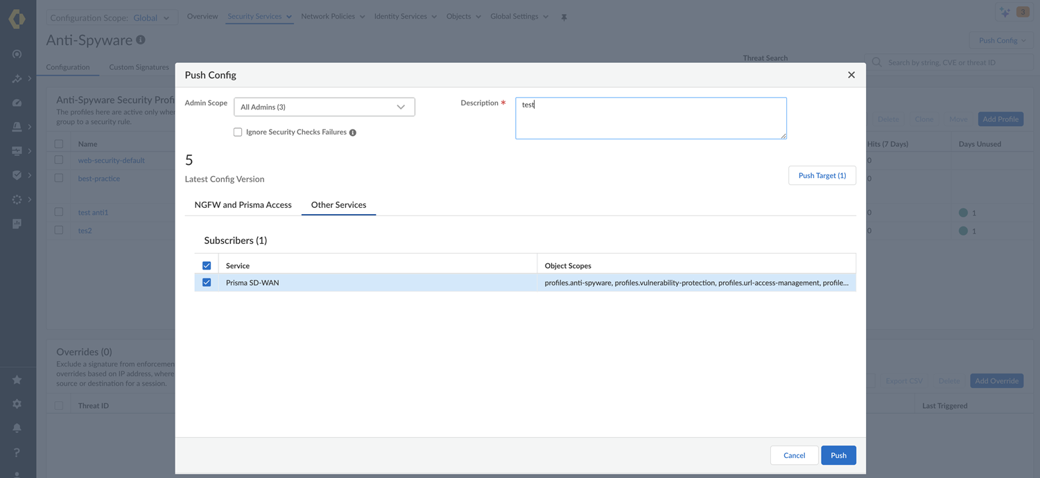 Refer here to know more about how to enforce security policies in Strata Cloud Manager.To deploy security service profiles, perform a Push for all configurations in Global Config and select Prisma SD-WAN as the destination target.