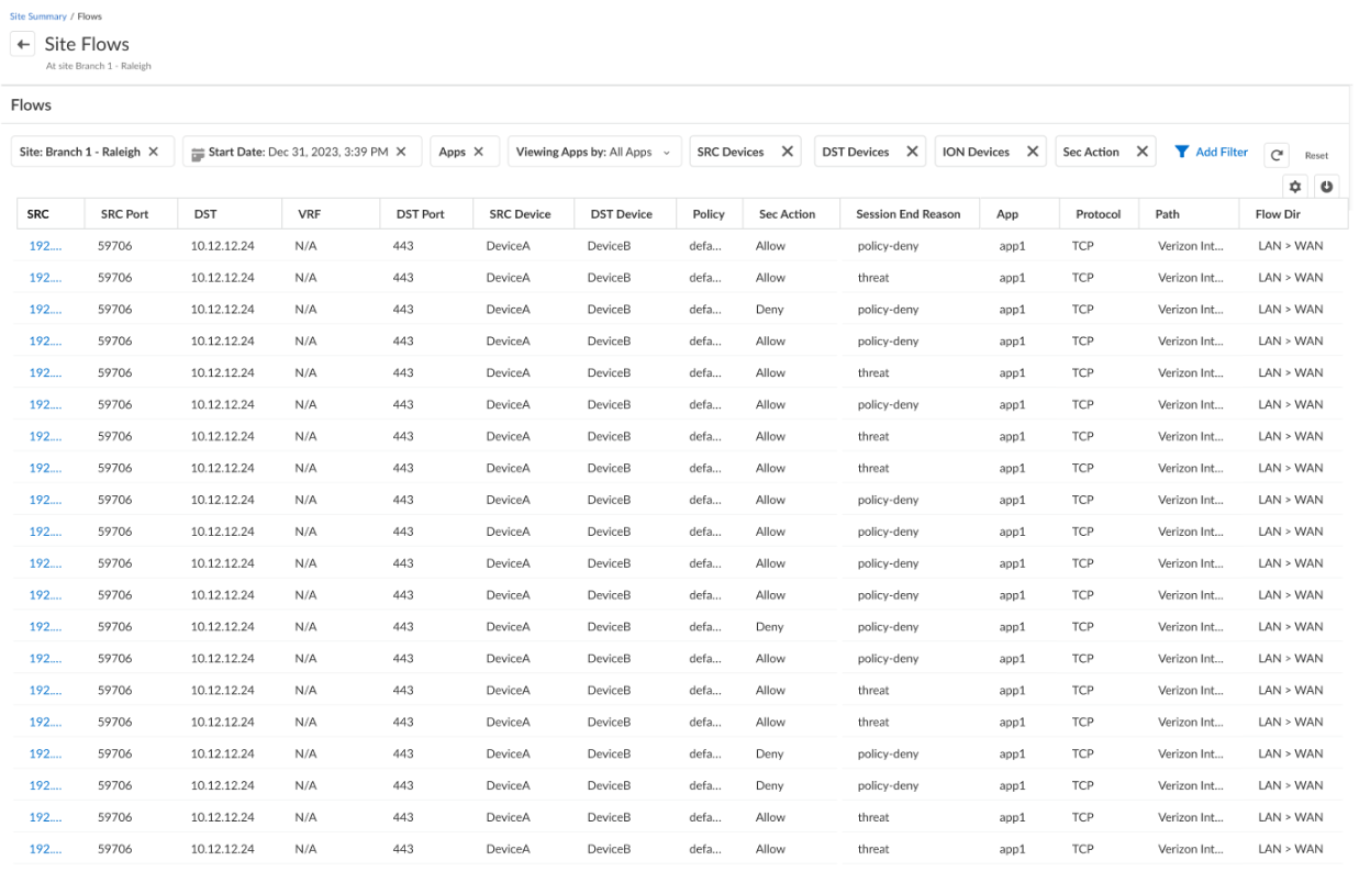 Flow Browser supports viewing Branch Security information, including threat prevention, URL filtering, and DNS security, to analyze network traffic. Flow records display threat metadata, including threat IDs, categories, severities, and actions taken, along with URL classifications and DNS security details. This information helps monitor security events and network traffic patterns effectively.To support these capabilities, fields related to threat prevention, URL filtering, and DNS security have been added to the flow records exported from the device.- In Strata Cloud Manager, select InsightsPrisma SD-WANBranch SitesFlows.You can filter flows by Session End Reason to view specific sessions, including those terminated due to threats (Anti-Spyware, Vulnerability Protection, DNS Security or URL Access Management).