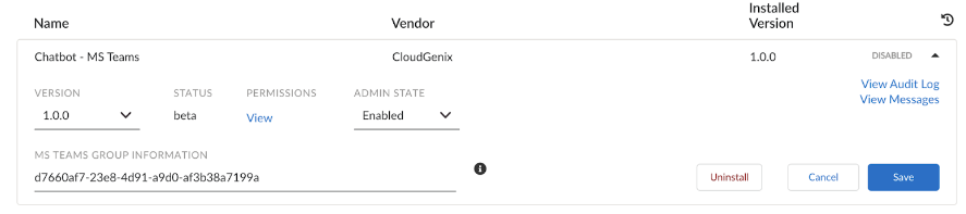 Contact the Palo Alto Support team if this CloudBlade does not appear in the list.In the Chatbot-MS Teams page, enter the following information in the fields shown below, change where appropriate.- Version: Select the latest version of the Chatbot-MS Teams CloudBlade.