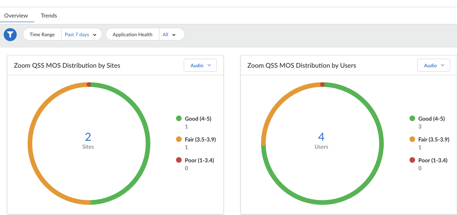 - Zoom QSS MOS Distribution by Users: shows the Zoom MOS distribution of good, fair, and poor applications across users. This application data can be filtered by audio, video, and screen share for a selected time period.