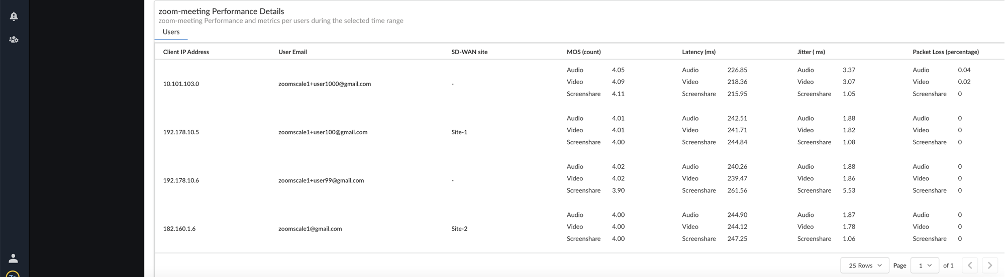 IP address, user email, SD-WAN site, MOS count, latency, jitter, and