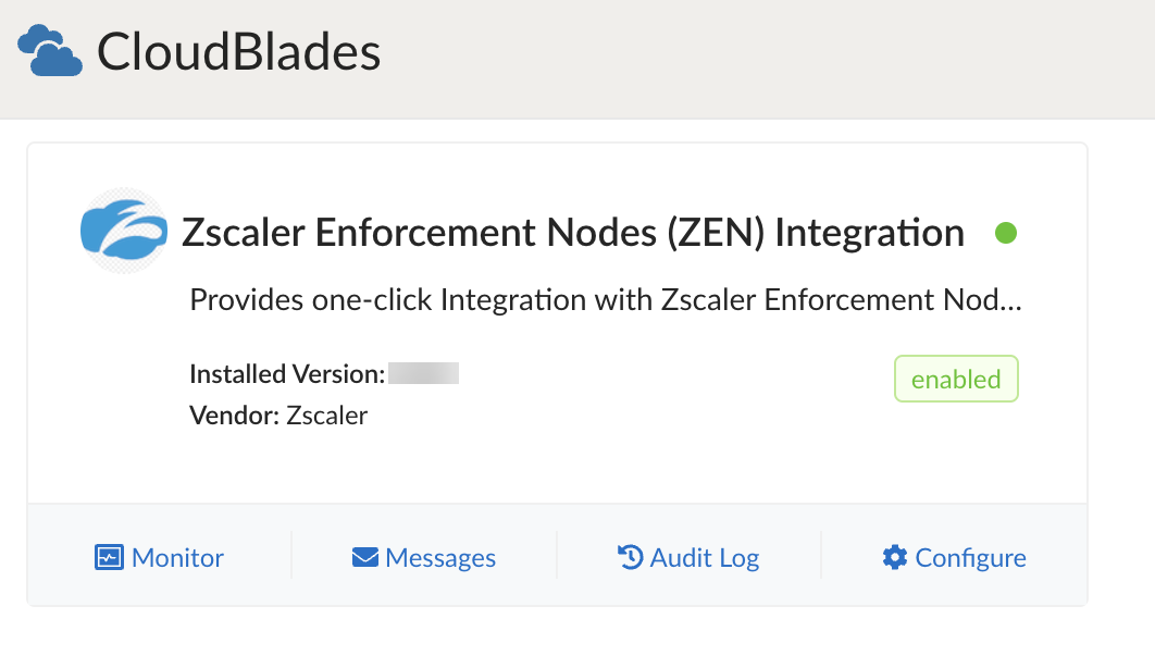Configure the Prisma SD-WAN CloudBlade to prepare the Prisma SD-WAN controller for integration.- In Strata Cloud Manager, go to ConfigurationPrisma SD-WANCloudBlades.Locate the Zscaler Enforcement Nodes (ZEN) Integration CloudBlade tile in the CloudBlades page and click Configure. If this CloudBlade does not appear, contact Palo Alto support team.