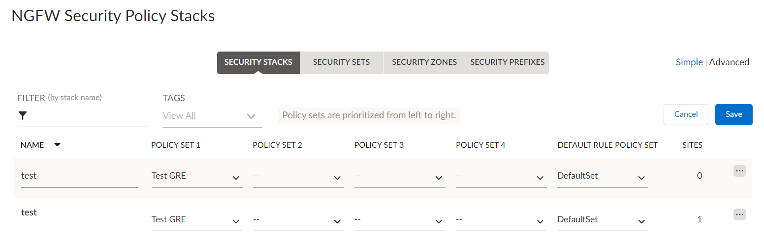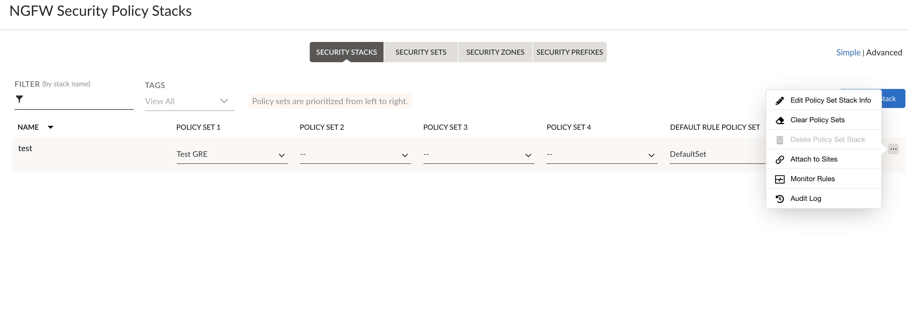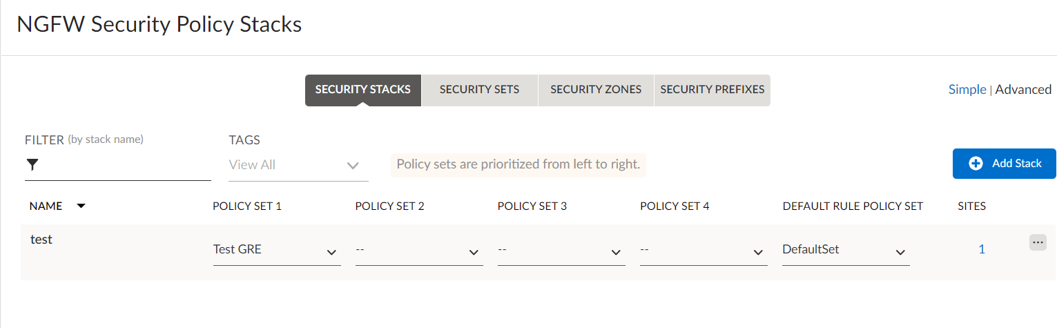 Add a security policy stack.- Select PoliciesSecurity and add a Stack.