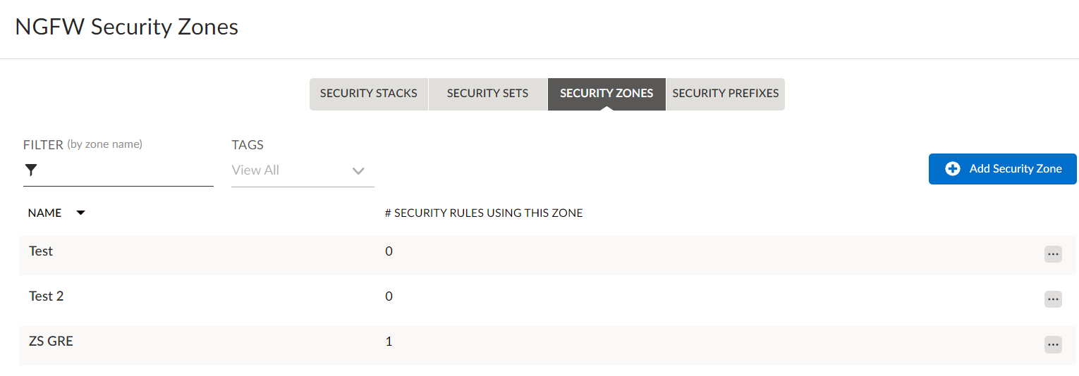 - In Strata Cloud Manager, go to ConfigurationPrisma SD-WANPoliciesSecurity.Select Security Zones and add a Security Zone.
