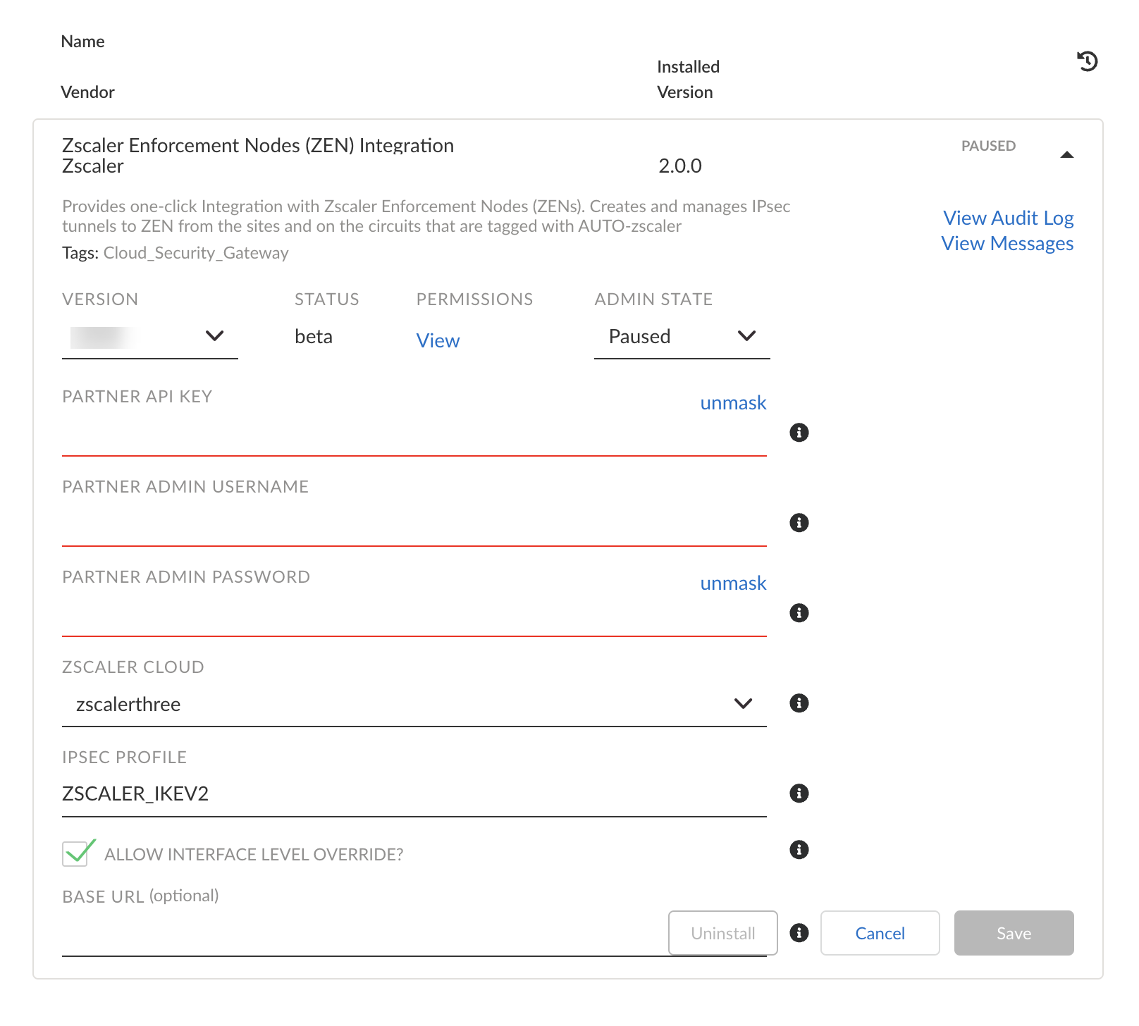 Enter the following information in the CloudBlade installation page.- From the Version list, select the required version.For Admin State, retain Enabled, which is the default value.For API Key, provide the SD-WAN key generated in the previous section.For Partner Admin Username and Partner Admin Password, provide the partner administrator account details created in the previous section.For Zscaler cloud, select the Zscaler cloud to which your subscription is attached (zscalerthree in the example below).From version 2.1.0 onwards, the CloudBlade supports govcloud which supports only IPsec tunnels.Specify the IPsec Profile name (case sensitive). The default is ZSCALER_IKEV2, which should be pre-provisioned along with the CloudBlade allocation. The tunnels to be created will be identified based on the tags created (AUTO-zscaler for IPSec and AUTO-zscaler-GRE for GRE; version 2.0.0 onwards).If you select Allow Interface Level Override for the IPsec profile, it will allow administrators to change the IPsec profile referenced at the Standard VPN tunnel level without the CloudBlade overriding this change. This is typically useful in case of troubleshooting scenarios.(Optional) Provide the base URL. If left blank, the base URL will be derived from the admin username domain.After you configure the settings, click Install (or Save, if the CloudBlade was previously installed).