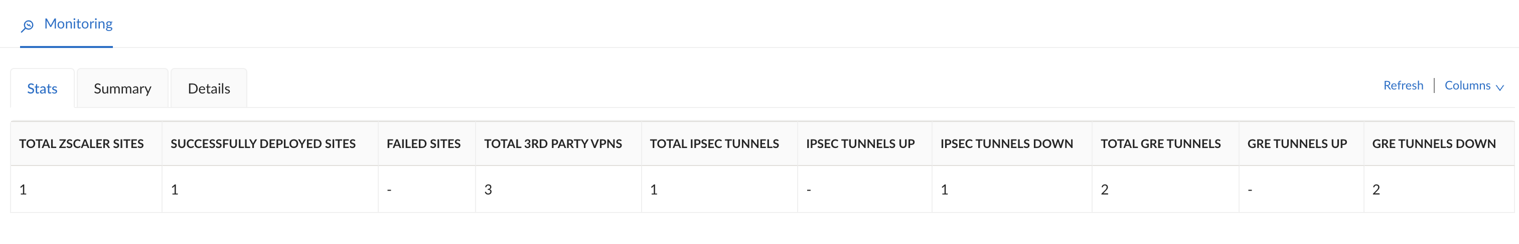 Select the Stats tab to see information on the Zscaler sites and status of the IPSec and GRE tunnels.