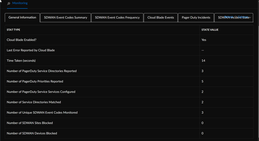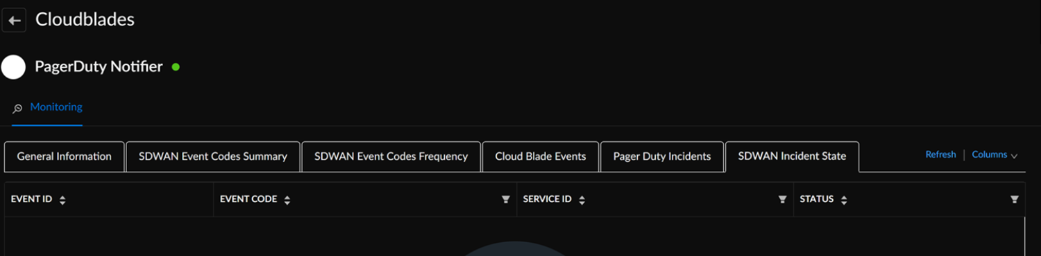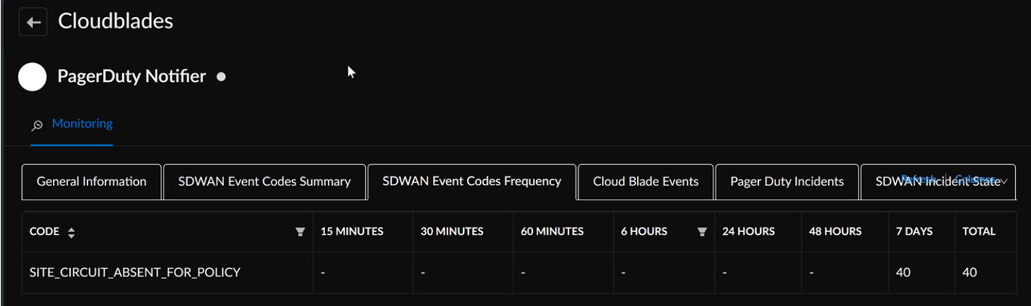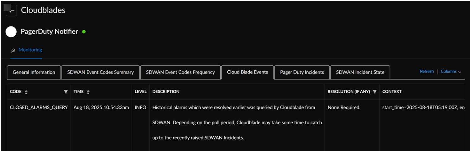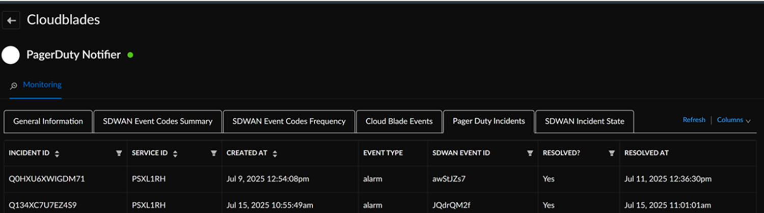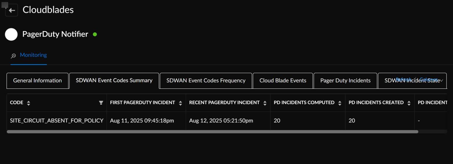 To monitor the status of events, go to ConfigurationPrisma SD-WANCloudBladesPagerDuty Notifier and select Monitor.