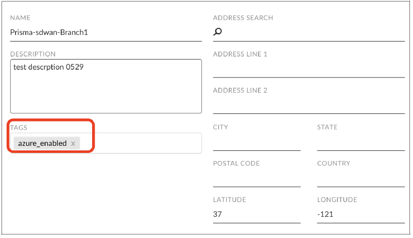 Once the CloudBlade is configured, the next task is to tag Prisma SD-WAN sites and interfaces to denote which sites and interfaces are candidates for integration with Azure Virtual WAN.- In Strata Cloud Manager, go to ConfigurationPrisma SD-WANBranch Sites and select the site that needs to be tagged.Select the edit icon, and in the Tags (case sensitive.) field, add the azure_enabled tag and enable it for Azure vWAN.