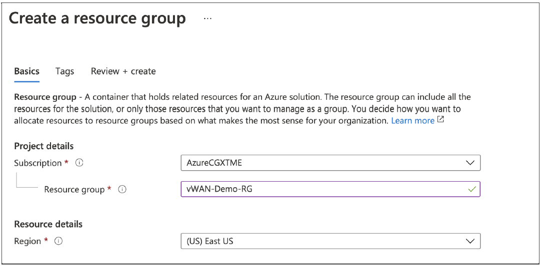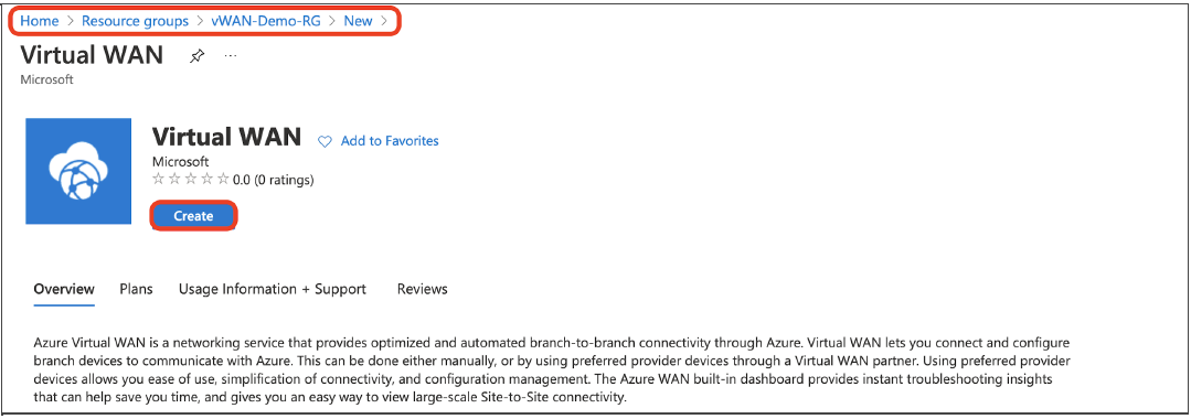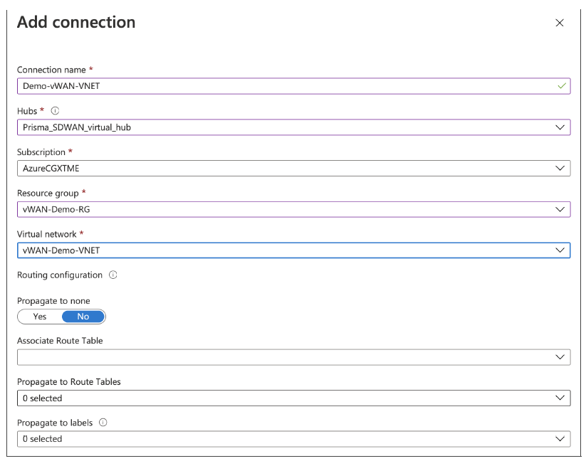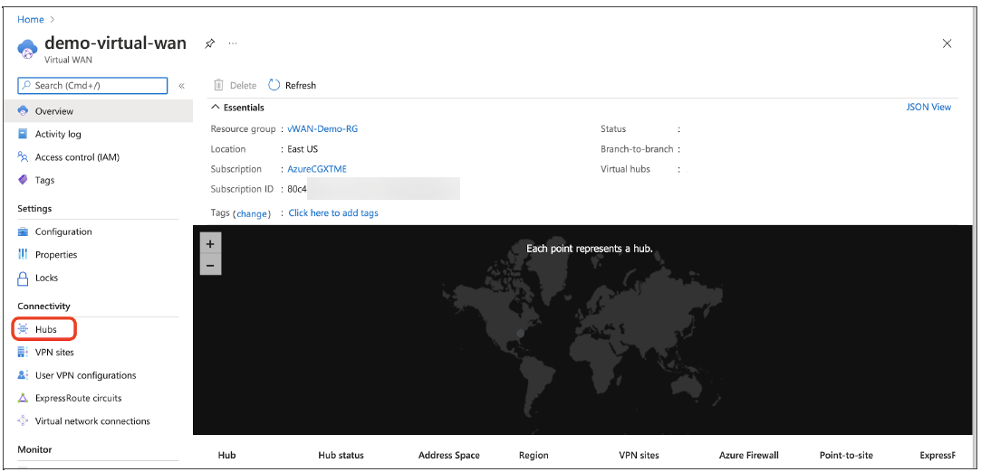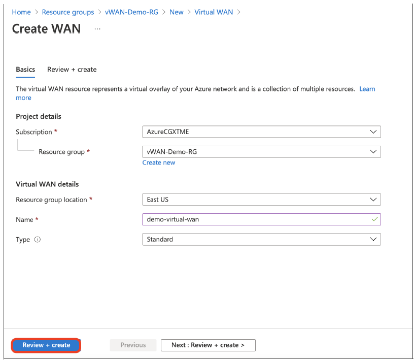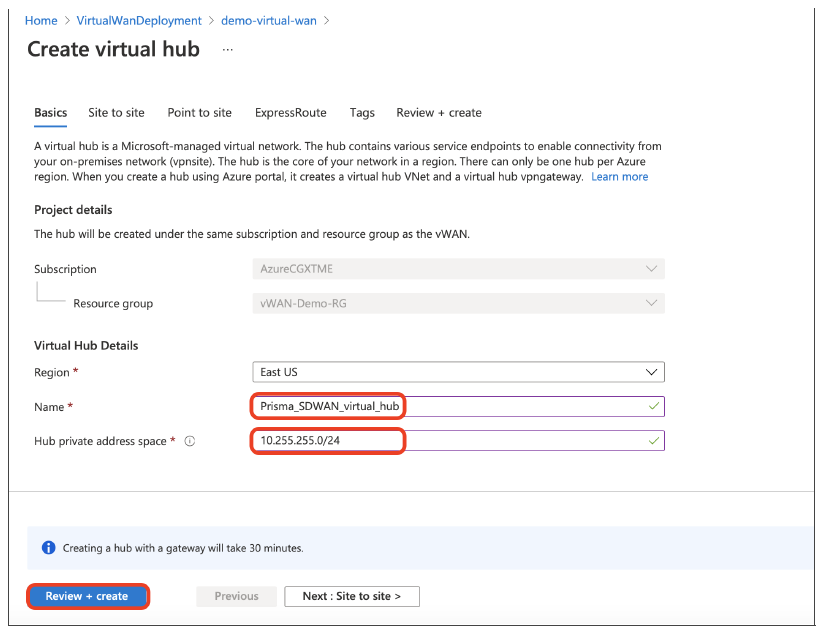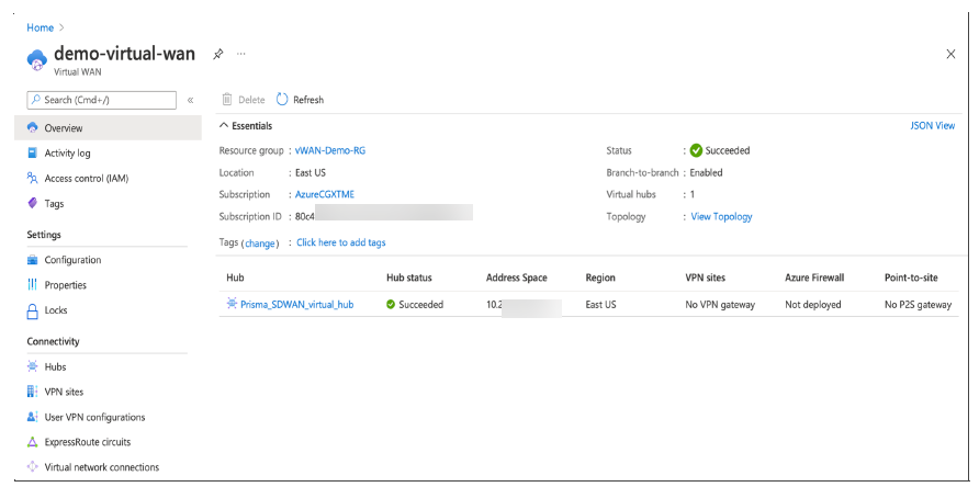 Create a Resource Group, a Virtual WAN object, and at least one Hub. Copy the Resource Group name and Virtual WAN name to be used later on Prisma SD-WAN.