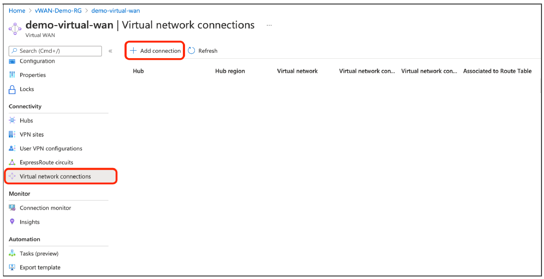 (Optional) Add a virtual network connection to Virtual WAN in order to associate an existing VNET hosting applications and services to a vWAN Hub, such that this network could be reachable via vWAN.