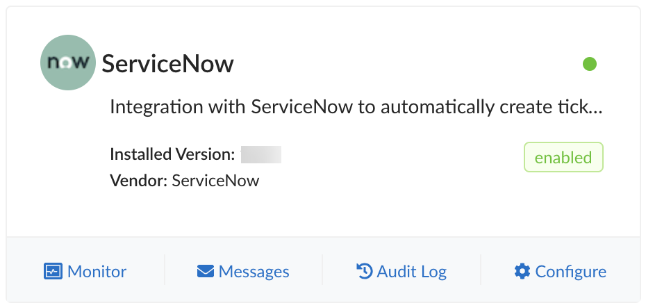 In CloudBlades, locate the ServiceNow CloudBlade. If this CloudBlade does not appear, contact Palo Alto Networks Support.For Insights, look for the ServiceNow - Circuit Insights CloudBlade.On the ServiceNow CloudBlade, click Configure to configure ServiceNow parameters.Some of the ServiceNow parameters display the column name and not the label, which is typically displayed on the user interface as the column header.ServiceNow Parameters Description ServiceNow URL This field contains the URL that will be used to connect to the ServiceNow instance via the ServiceNow Table APIs. The URL must include the entire domain name and the table name. The URLfollows the following format: https://<domain name>/api/now/table/myTablewhere myTable is the name of the Table on ServiceNow where tickets will be created. ServiceNow Username Incident tickets on ServiceNow will be created using this User. Make sure that the User has the right set of privileges, especially to make changes to the table via APIs. The ServiceNow Developers document lists the following roles to be assigned to a user: Role required: web_service_admin, rest_api_explorer, or admin ServiceNow Password Password for the above user. These credentials will be used by the CloudBlade to create/edit tickets on the ServiceNow instance using the ServiceNow Table APIs. Poll Interval Poll Interval is the interval time in seconds. After you install, the CloudBlade will query the controller for any standing alarms based on the set poll interval. Retry Attempts Retry attempts indicate the number of attempts that happen when a ticket could not be created for an event. Retry attempts can be anywhere between 0 and 5. The default value is 3. Exclude Events Raised and Cleared during Poll Interval When this option is checked, the events which are created and cleared (resolved) during the poll interval will not be ticketed in ServiceNow. Event Codes These are event codes used in monitoring and which need incident tickets to be created in ServiceNow. These event codes need to match the Prisma SD-WAN event codes. You can select one or multiple event codes from the drop-down, for example: NETWORK_VPNLINK_DOWN, NETWORK_DIRECTINTERNET_DOWN,NETWORK_DIRECTPRIVATEWAN_DOWN. ServiceNow Table Column to Store: EventCode Column name on the Incident table to store Prisma SD-WAN event code. ServiceNow Table Column to Store: CorrelationID Column name on the Incident table to store Prisma SD-WAN event correlation_id. ServiceNow Table Column to Store: Severity Column name on the Incident table to store Prisma SD-WAN event severity. ServiceNow Table Column to Store: EventID This is an optional field. This is a Column name on the Incident table to store a Prisma SD-WAN Event ID. ServiceNow Table Column to Store: Time This is an optional field. This is a Column name on the Incident table to store the Prisma SD-WAN event time. ServiceNow Table Column to Store: Site_ID This is an optional field. This is a Column name on the Incident table to store a Prisma SD-WAN event site_id, which is translated to its site name. ServiceNow Table Column to Store: Element_ID This is an optional field. This is a Column name on the Incident table to store Prisma SD-WAN eventelement_id , which is translated to its device name. ServiceNow Table Column to Store: Entity_Ref This is an optional field. This is a Column name on the Incident table to store Prisma SD-WAN evententity_ref, after a name-ID translation. ServiceNow Table Column to Store: Info This is an optional field. This is a Column name on the Incident table to store Prisma SD-WAN event info, after a name-ID translation. ServiceNow Table Column to Store: Acknowledged This is an optional field. This is a Column name on the Incident table to store Prisma SD-WAN event acknowledged attribute. ServiceNow Table Column to Store: Cleared This is an optional field. This is a Column name on the Incident table to store Prisma SD-WAN event cleared attribute. ServiceNow Table Column to Store: Type This is an optional field. This is a Column name on the Incident table to store Prisma SD-WAN event type. ServiceNow Table Column to Store: Suppressed This is an optional field. This is a Column name on the Incident table to store a Prisma SD-WAN event suppressed state. ServiceNow Table Column to Store: Suppressed_Info This is an optional field. This is a Column name on the Incident table to store a Prisma SD-WAN event suppressed info. ServiceNow Table Column to Store: Policy_Info This is an optional field. This is a Column name on the Incident table to store a Prisma SD-WAN event policy info. ServiceNow Table Column to Store: Notes This is an optional field. This is a Column name on the Incident table to store the Prisma SD-WAN event notes. ServiceNow Table Column to store Incident State This is a mandatory field. This is a Column name to store the state of an incident. This column will be set to Resolved, once the event condition for which the ticket was created is resolved. ServiceNow Table: Custom This is an optional field. This field is for any custom value that you intend to include for every incident ticket. This is typically used by IT organizations to include details about an environment or to include caller information. Enter a value in JSON format for this field i.e. key-value pairsFor example:“caller”: “Prisma SDWAN Auto Ticketing”,“environment”: “Production” For Insights, the following columns need to be populated:Circuit Insight Parameters Description ServiceNow URL This field contains the URL that will be used to connect to the ServiceNow instance via the ServiceNow Table APIs. The URL must include the entire domain name and the table name. The URLfollows the following format: https://<domain name>/api/now/table/myTable, where myTable is the name of the Table on ServiceNow where tickets will be created. ServiceNow Username Incident tickets on ServiceNow will be created using this User. Make sure that the User has the right set of
