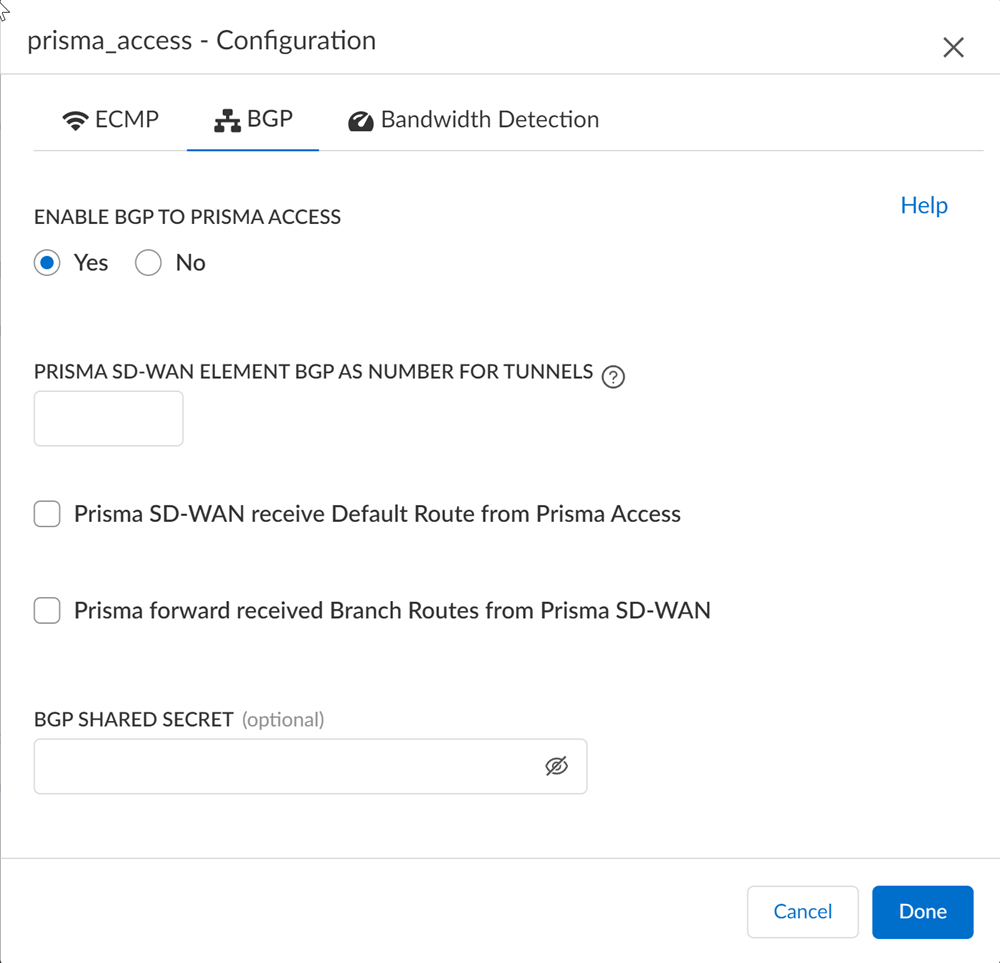 Once this configuration is completed, on the next integration run, the CloudBlade will begin the onboarding process to connect the Prisma SD-WAN ION device and Prisma Access. This process takes place through one or more IPSec tunnels, depending on how many interfaces and tags are configured. This can take several integration cycles for all the tunnels to appear and be active on the Prisma SD-WAN web interface.Configure BGP- Click the extended prisma_access tag and navigate to the BGP section.You can also view or change the BGP settings for Prisma Access from the BGP section.If the site already has a Global BGP configuration, this won't change the AS parameters under RoutingBGP.(Optional) Select Prisma SD-WAN receive Default Route from Prisma Access if needed.At this time, this can be left unchecked based on how Prisma SD-WAN instantiates the Standard VPN to Prisma Access.(Optional) Select Prisma forward received Branch Routes from Prisma SD-WAN if needed.