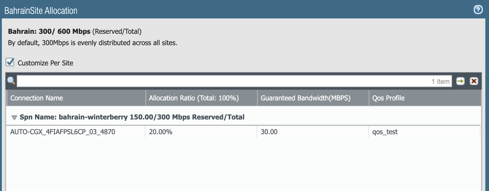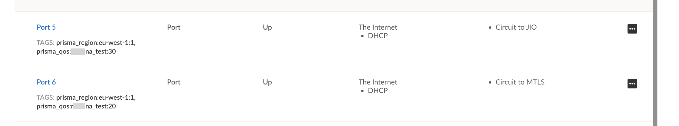 Check the Customize Per Site check box and click OK.Select Commit and Push to save the changes.In Prisma SD-WAN, navigate to the SiteInterfaces/Circuits and assign interface level tags in the following format.prisma_qos:<profile_name>:[0-100]The profile name for QoS will be the same name as the profile created in step 1.Interface/Circuit level tagging can be done for both ECMP and Non-ECMP enabled sites in Prisma SD-WAN.- Non-ECMP: Go to the site on Prisma SD-WAN where you wish to customize QoS and tag the interface or circuit. In the example shown below, the allocated bandwidth is 20%.