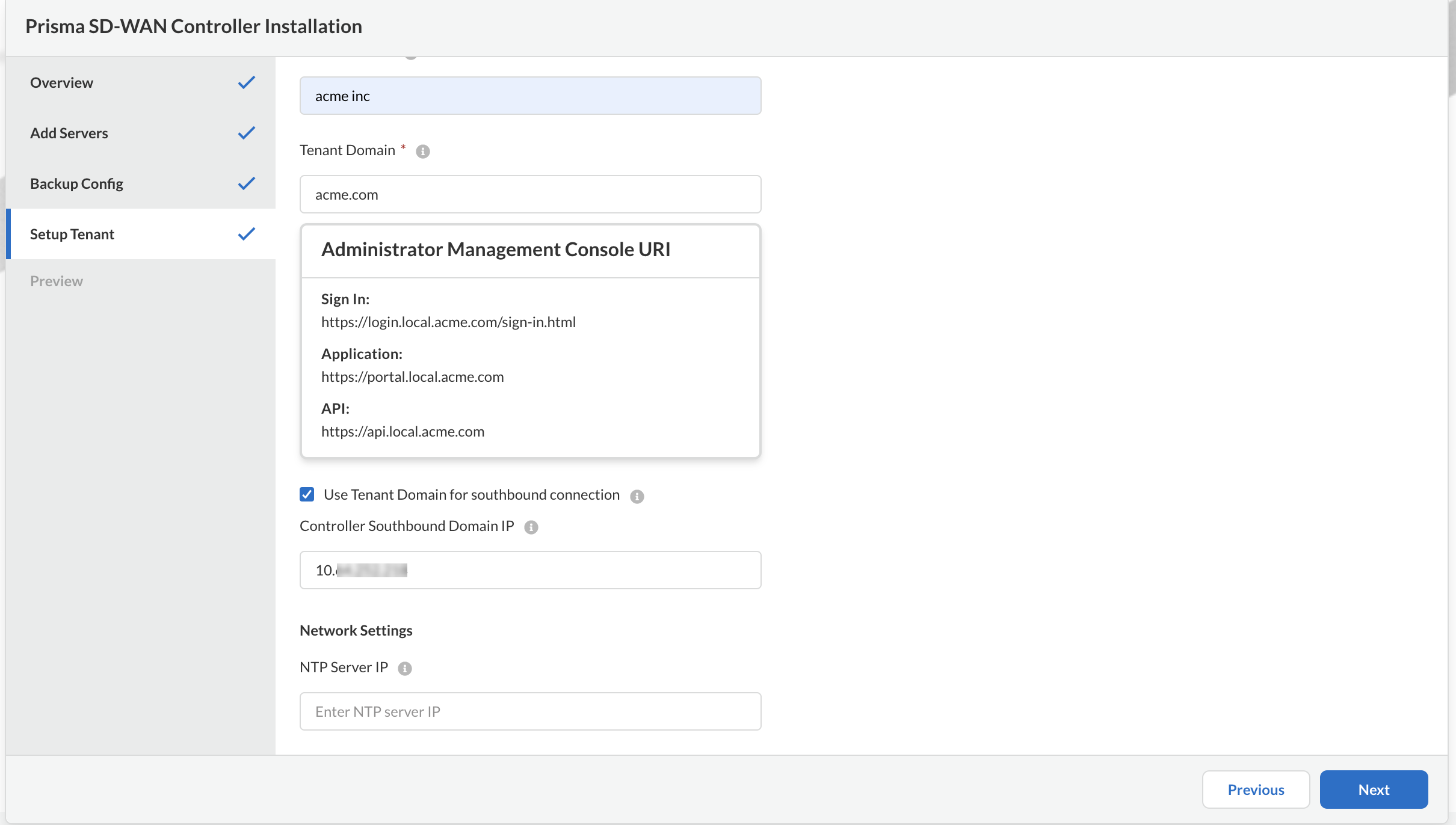 Click Next.Setup Tenant by providing the Tenant Name, Tenant Domain, NTP Server IP address, and optionally Use Tenant Domain for southbound connection.Tenant domain for southbound connection is an optional field, if you provide the Tenant Domain for southbound connection when setting up the tenant, the given domain name is used. If you select to use the southbound domain, enter the domain name and IP address.