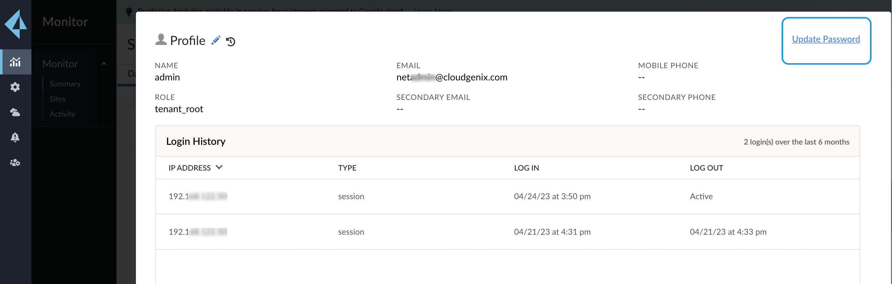 Change the Administrator console default password to secure your deployment. - Log in to the Administrator console using the default credentials.Select the user icon at the bottom left corner of the screen and select User Profile.Select Update Password.