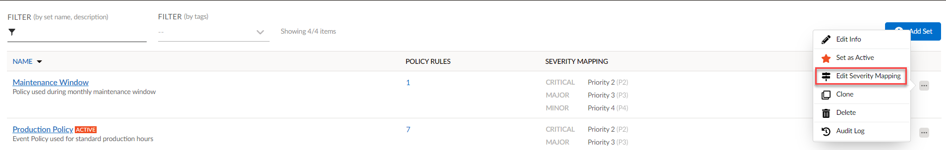 - In Strata Cloud Manager, select IncidentsPrisma SD-WANSettings and click + Add Set.Enter a name for the new incident policy set with an optional description and tags.Set As Active to make this new incident policy set active.(Optional) Clone From An Existing Set to choose a policy set from the drop-down list.Click Create to create the new incident policy set.(Optional) Click Edit Severity Mapping from the ellipsis menu to edit the severity and priority mapping.To change the default severity to priority mapping, you can edit the default severity mapping.